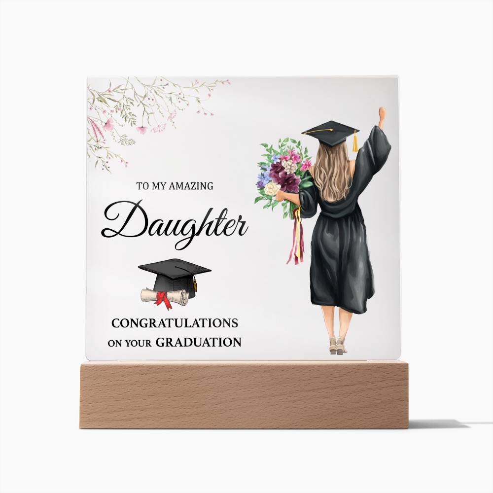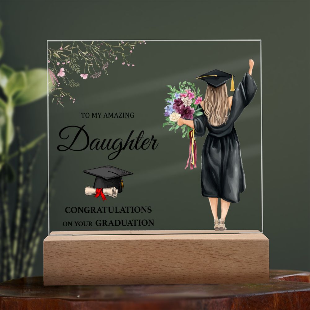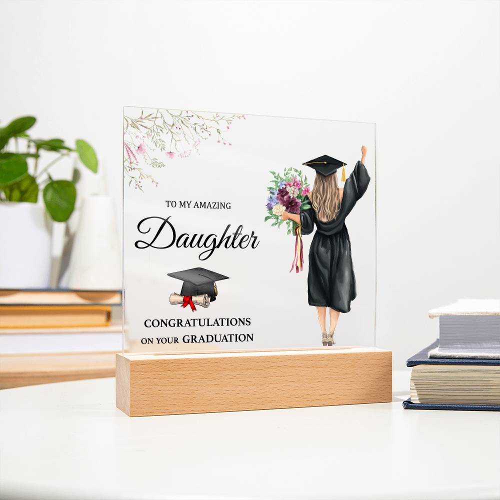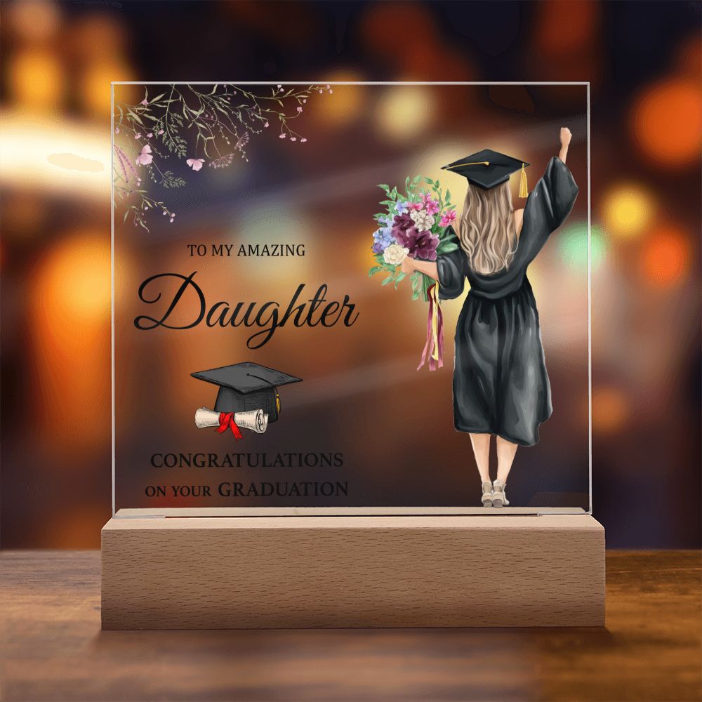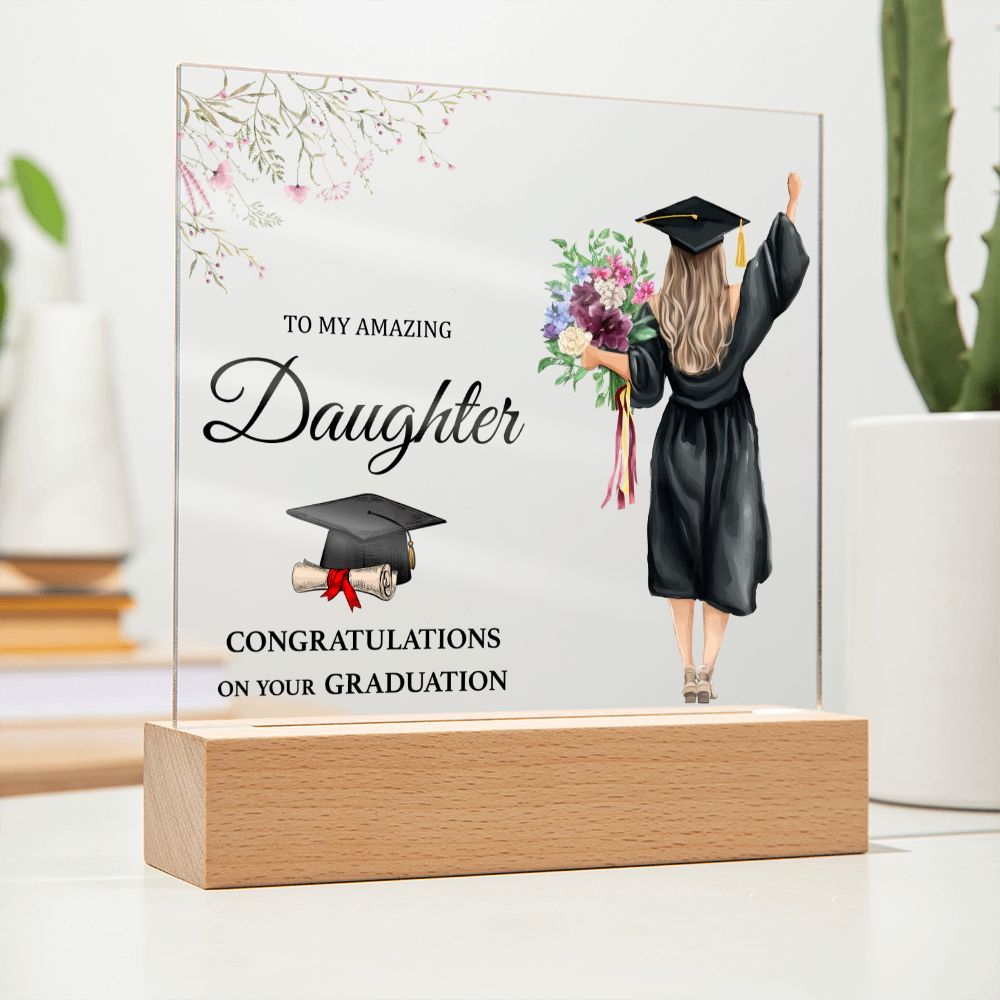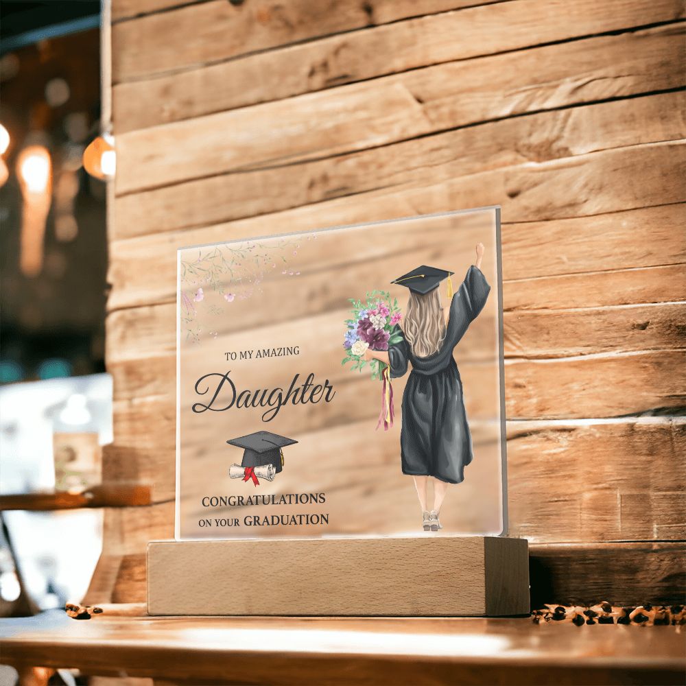 CONGRATULATION ON YOUR GRADUATION, ACRYLIC SQUARE PLAQUE, GRADUATION GIFT FOR DAUGHTER, ACRYLIC PLAQUE WITH WOODEN LED BASE, GRADUATION DESK DECOR