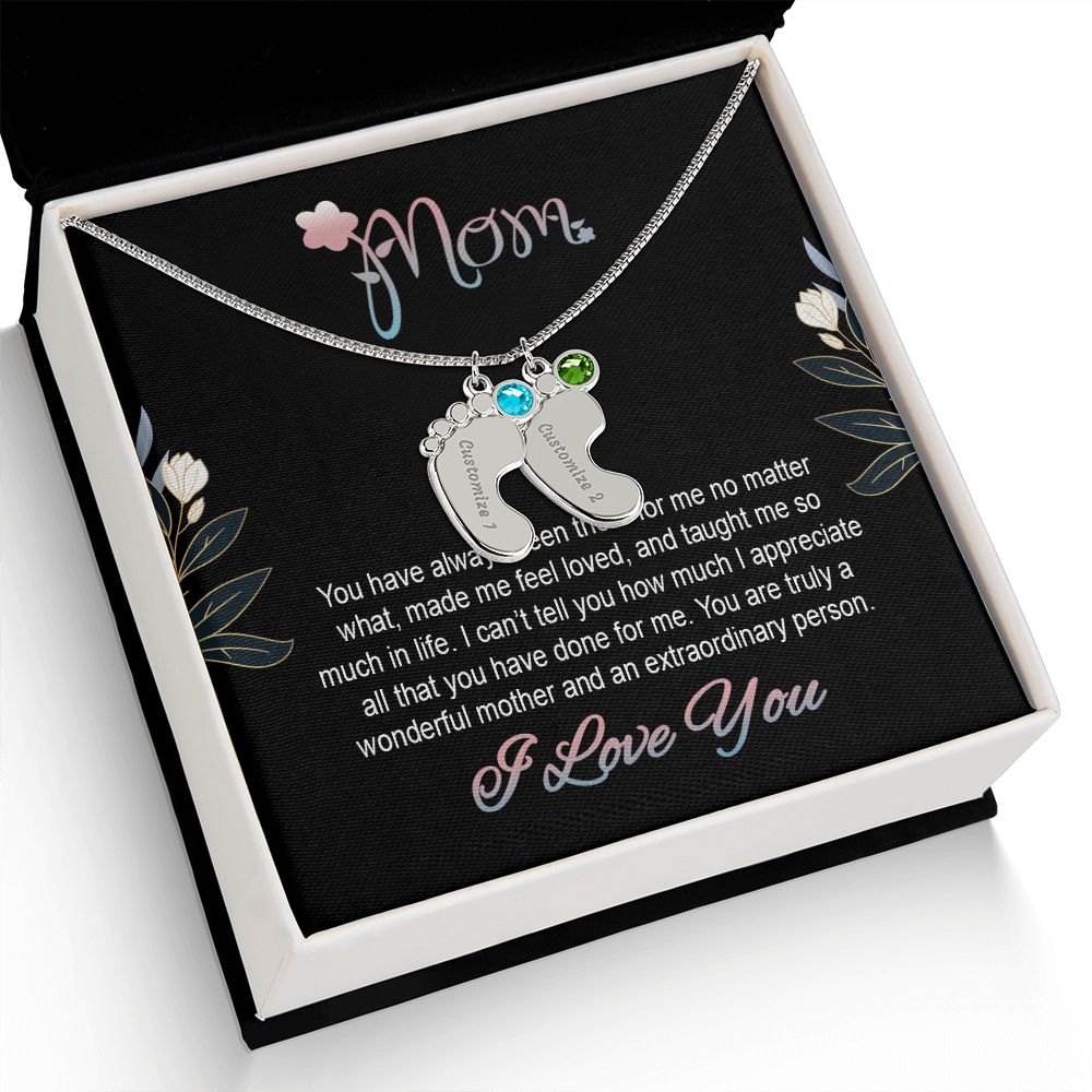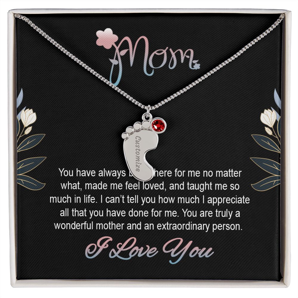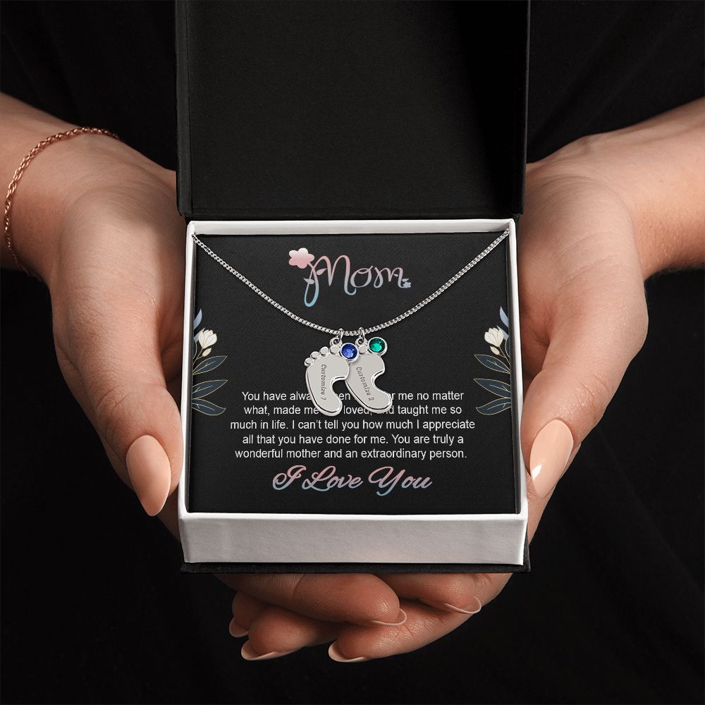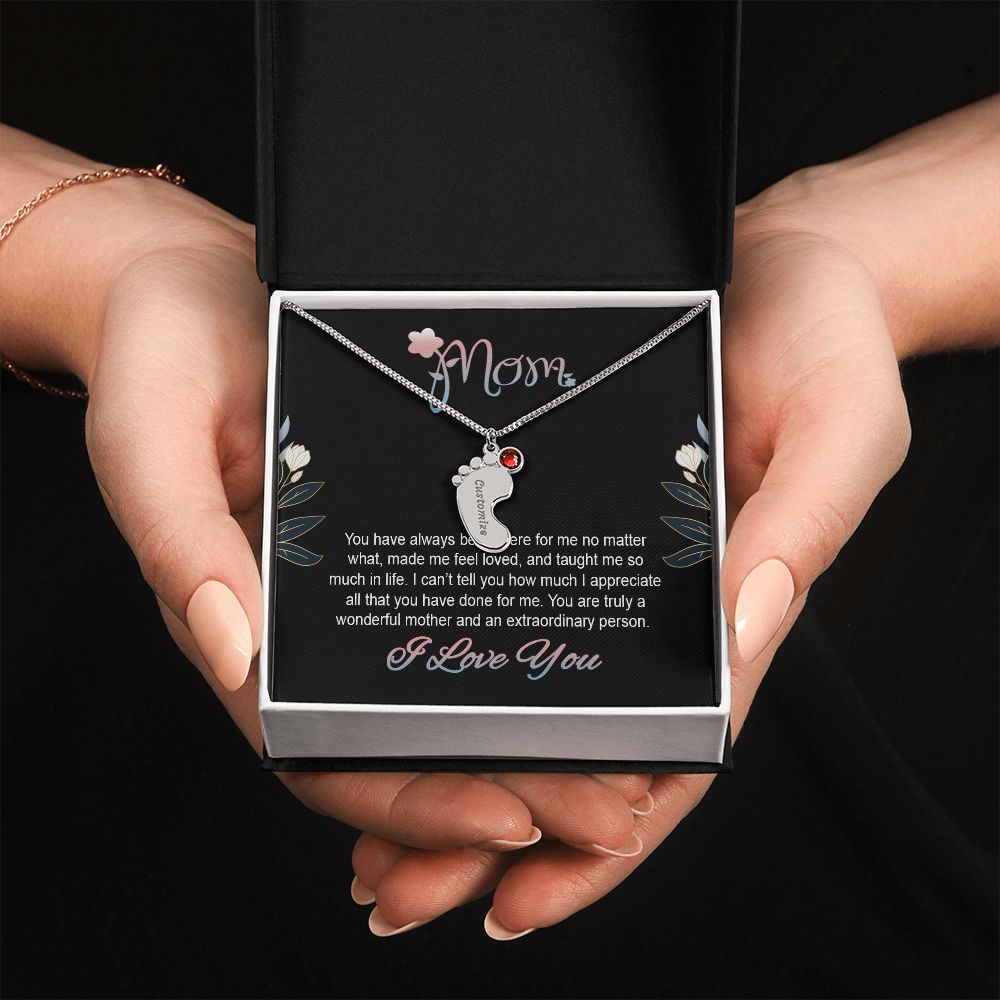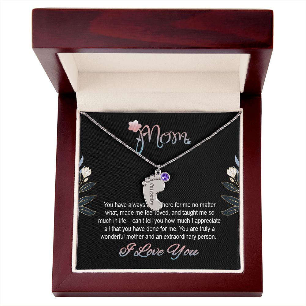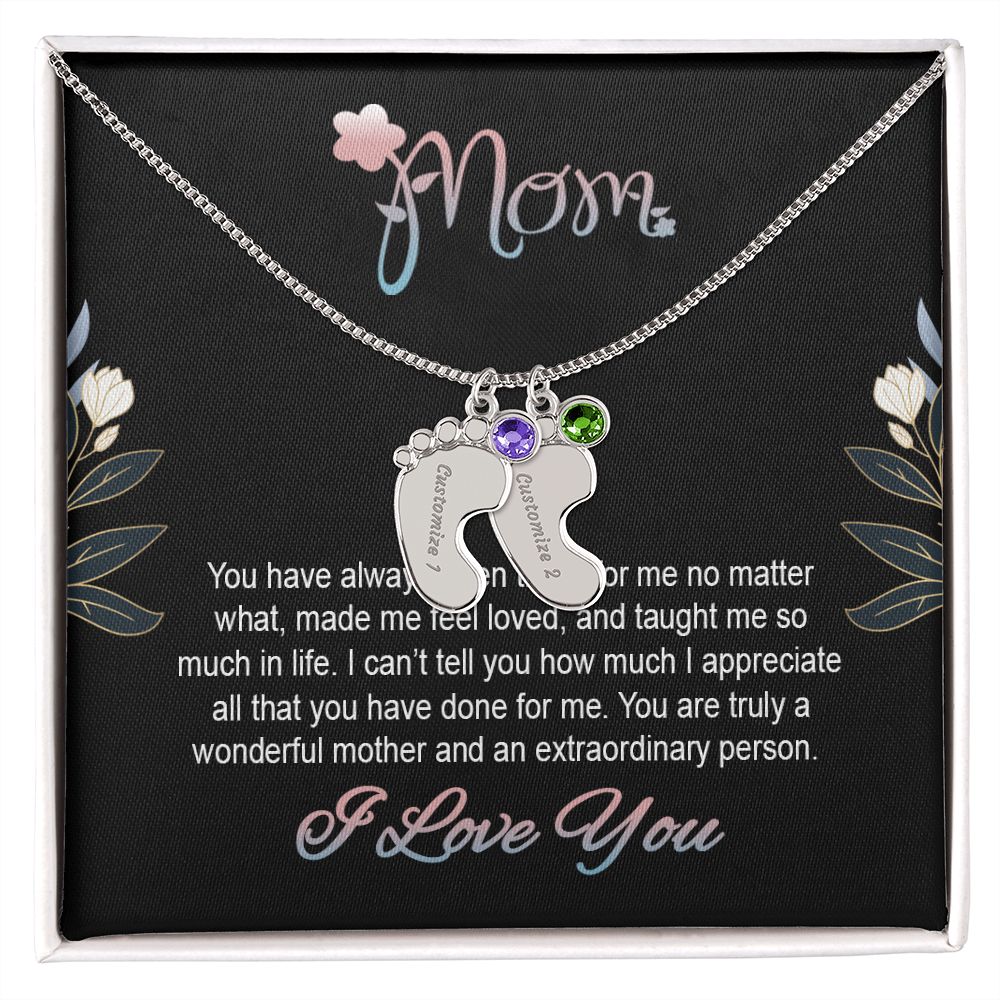 ENGRAVED BABY FEET WITH NAME AND BIRTHSTONE, NECKLACE GIFT FOR MOM WITH KIDS NAME, WITH MESSAGE CARD, BIRTHDAY/ MOTHER'S DAY GIFT FOR MOM FROM SON/DAUGHTER