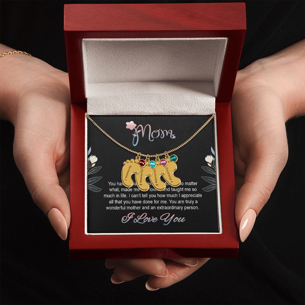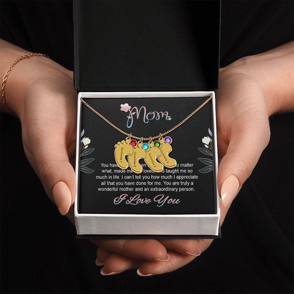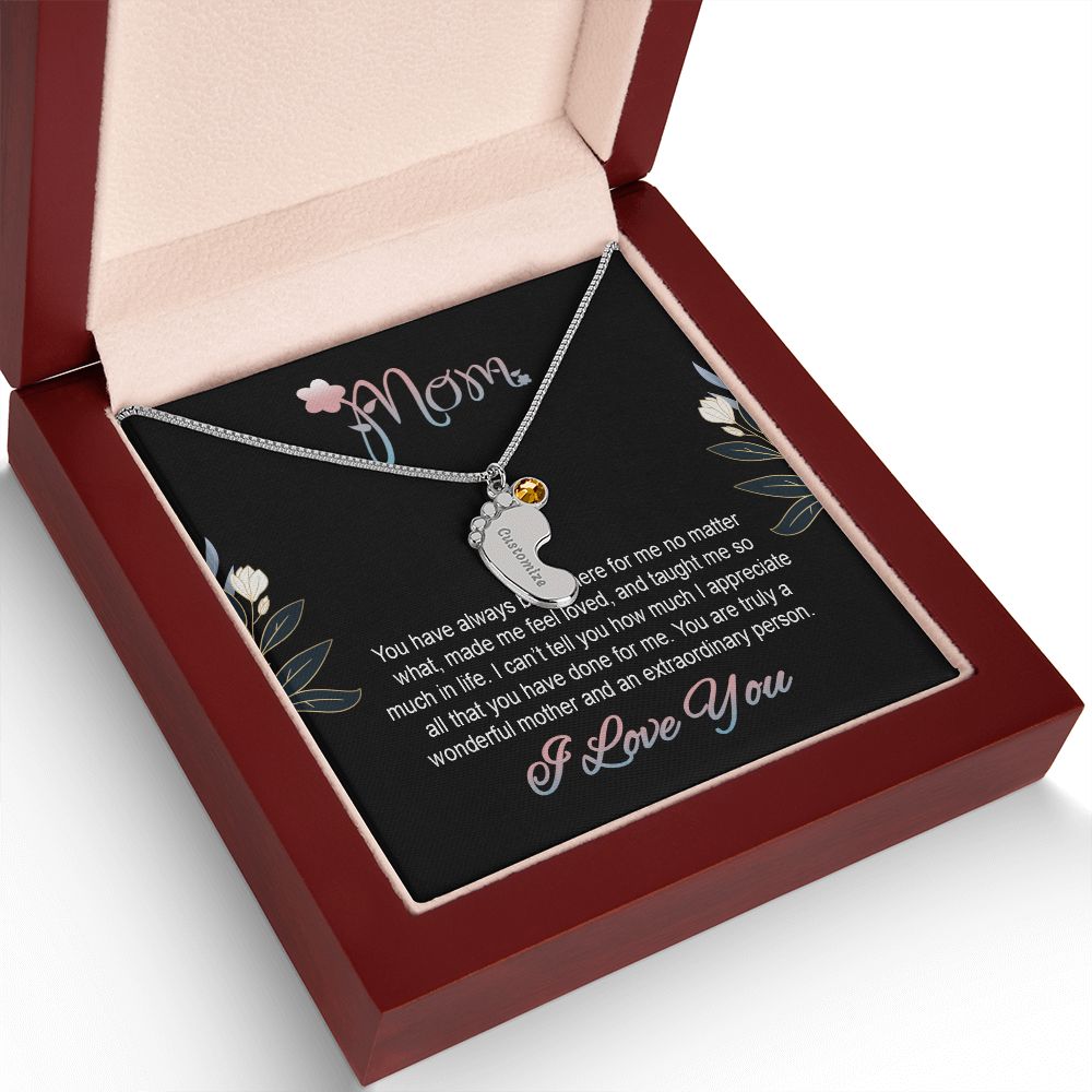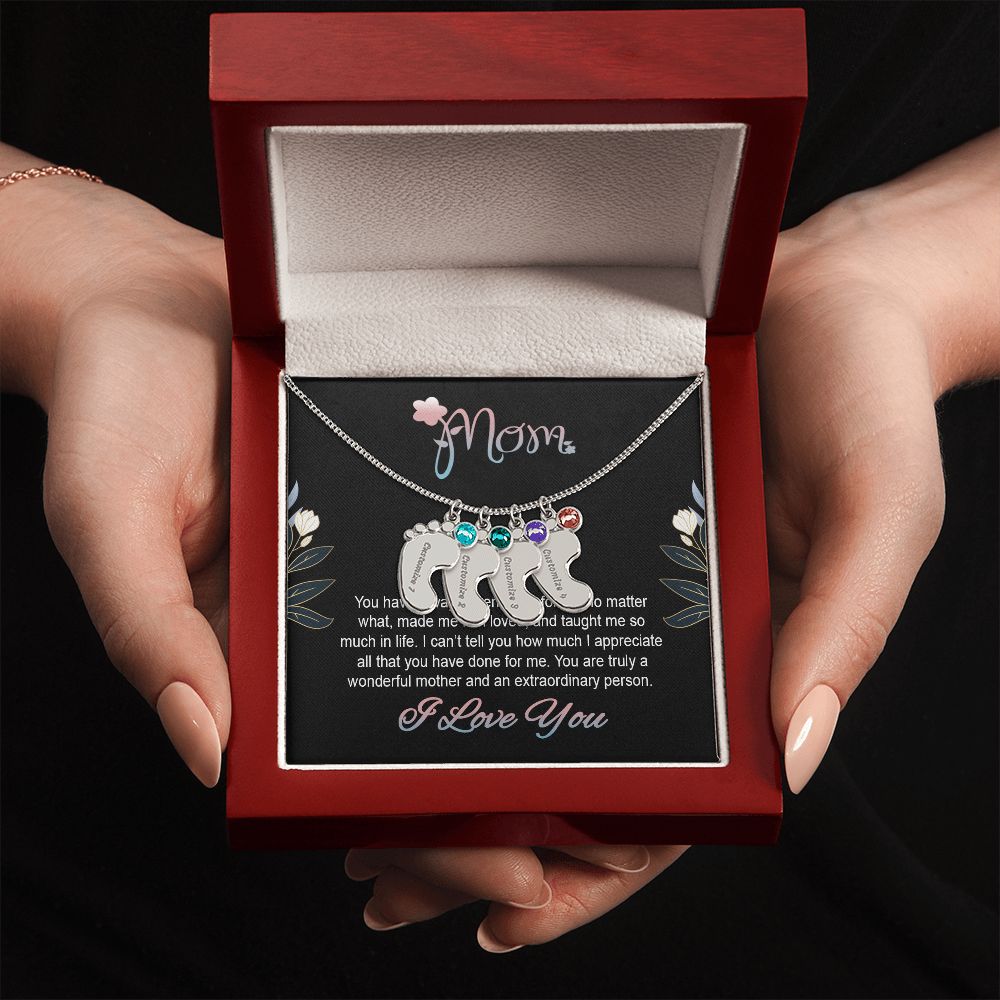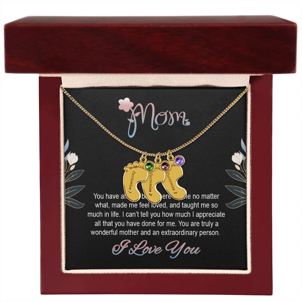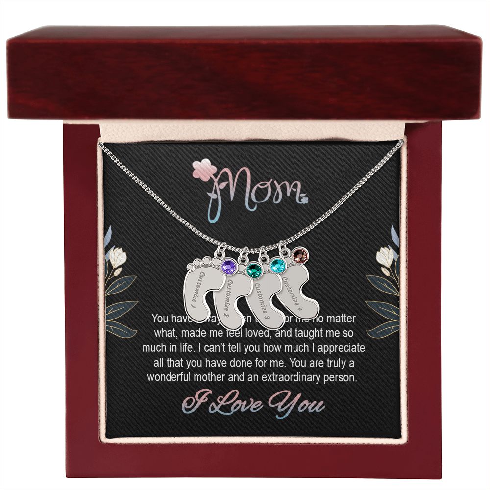 ENGRAVED BABY FEET WITH NAME AND BIRTHSTONE, NECKLACE GIFT FOR MOM WITH KIDS NAME, WITH MESSAGE CARD, BIRTHDAY/ MOTHER'S DAY GIFT FOR MOM FROM SON/DAUGHTER