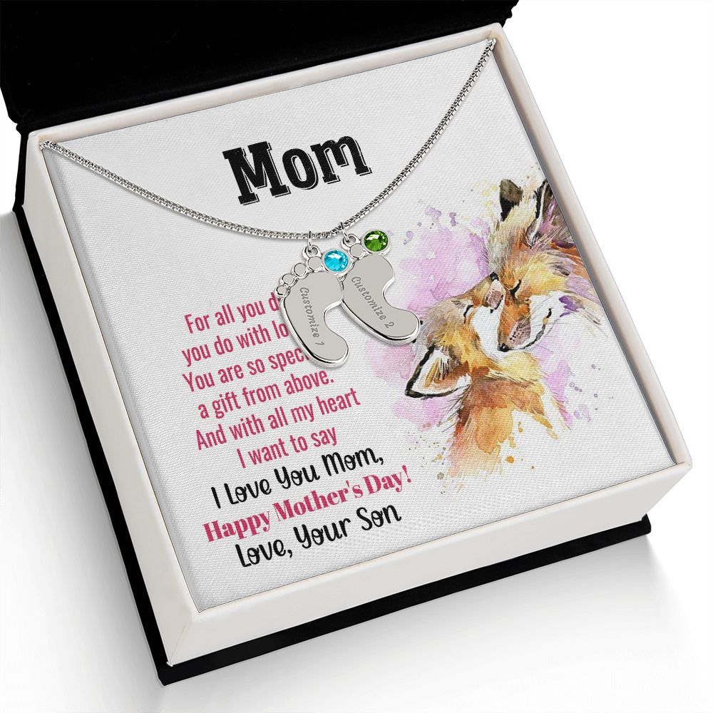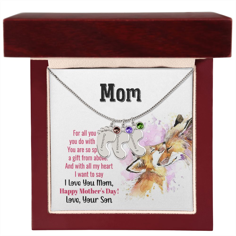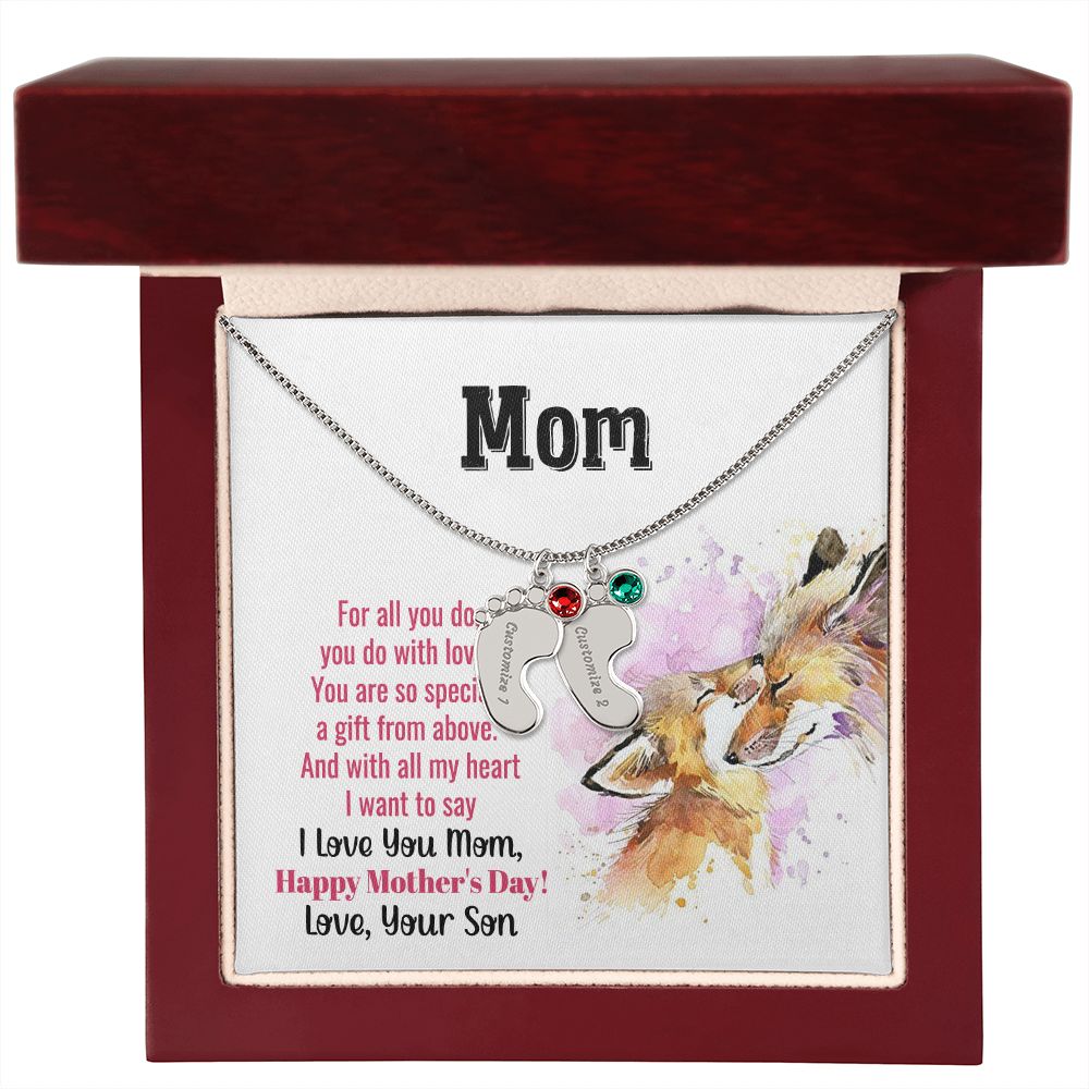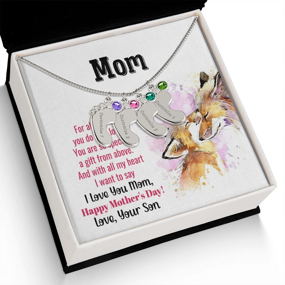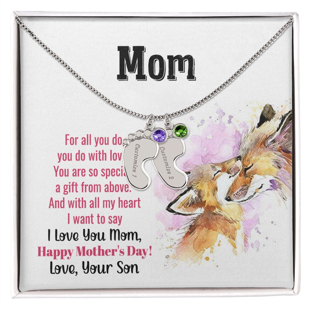 ENGRAVED BABY FEET WITH NAME AND BIRTHSTONE, NECKLACE GIFT FOR MOM WITH KIDS NAME, WITH MESSAGE CARD, MOTHER'S DAY GIFT FOR MOM FROM SON