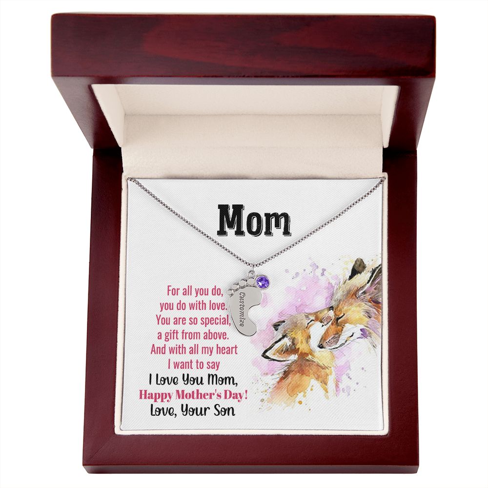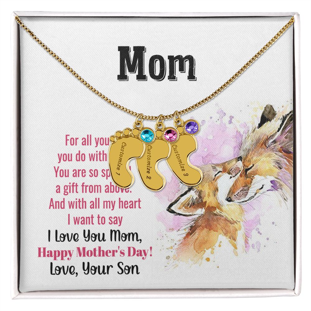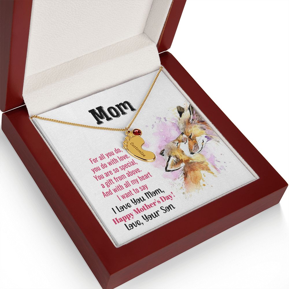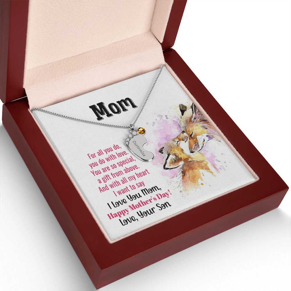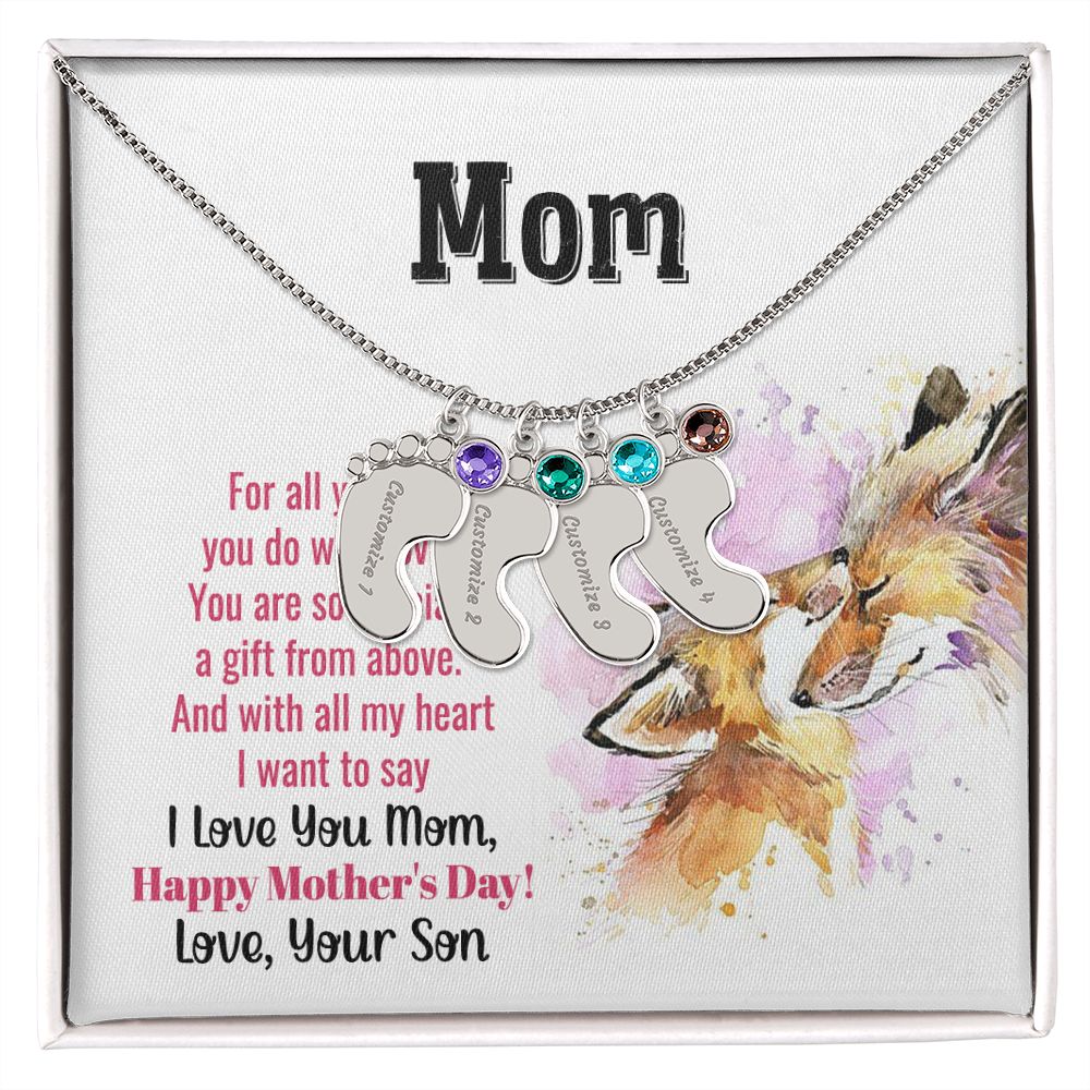 ENGRAVED BABY FEET WITH NAME AND BIRTHSTONE, NECKLACE GIFT FOR MOM WITH KIDS NAME, WITH MESSAGE CARD, MOTHER'S DAY GIFT FOR MOM FROM SON