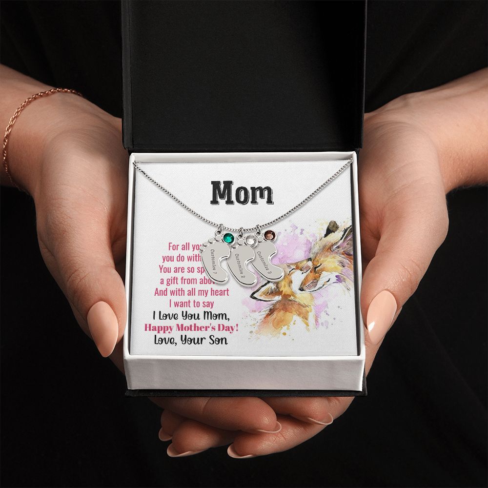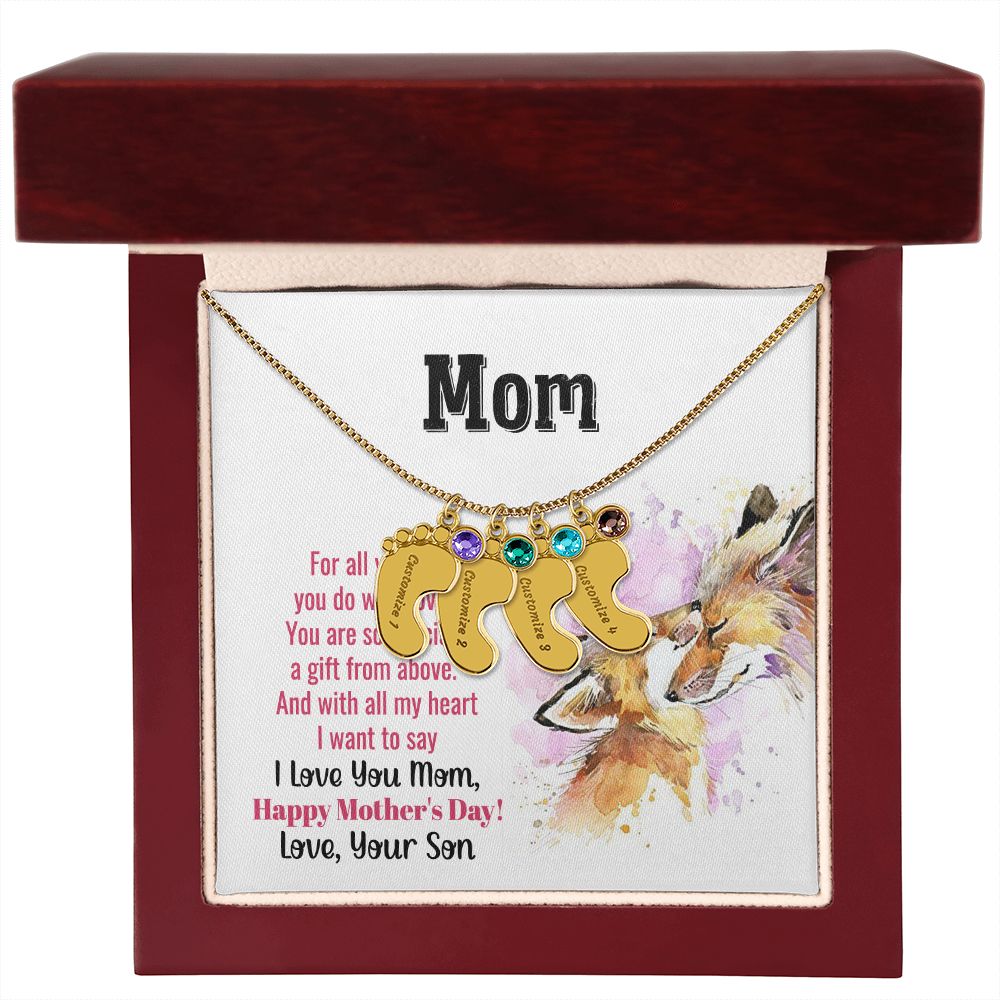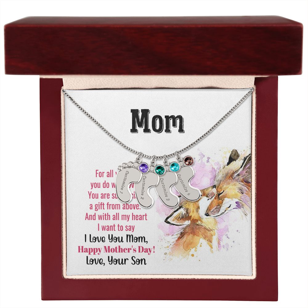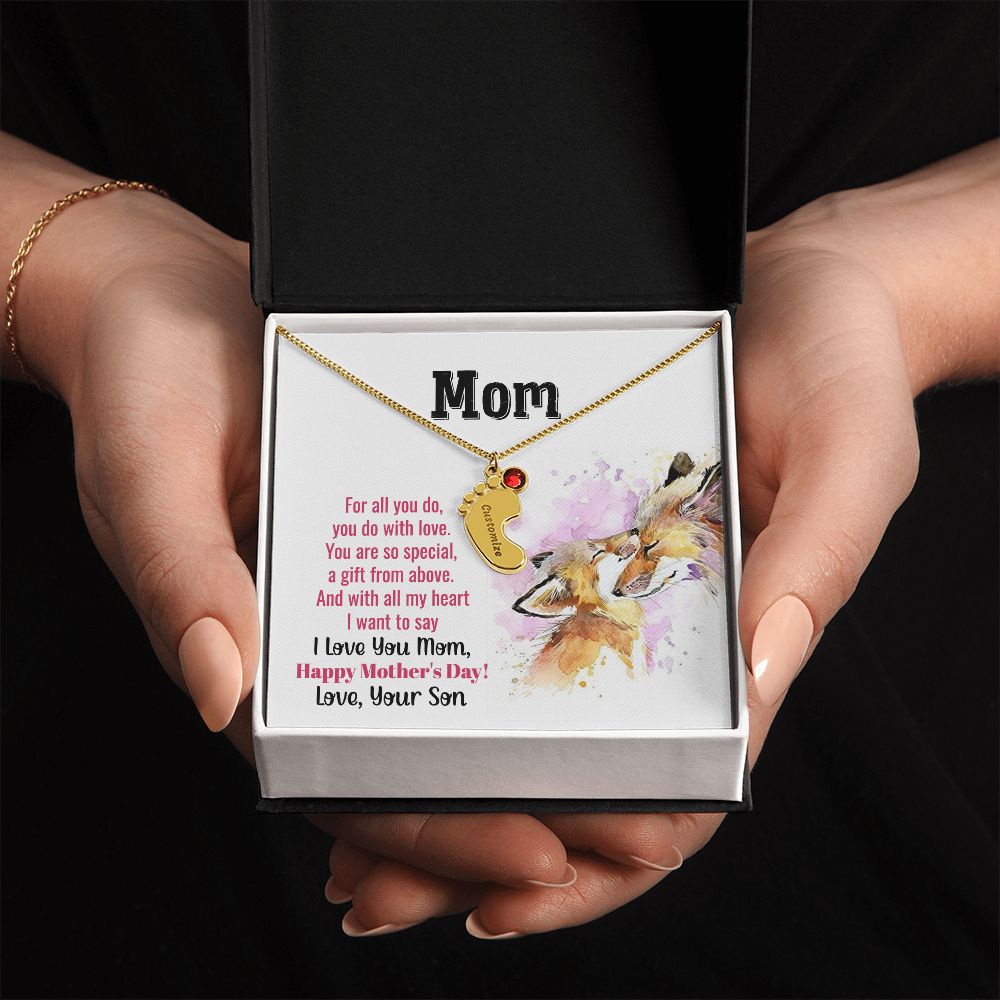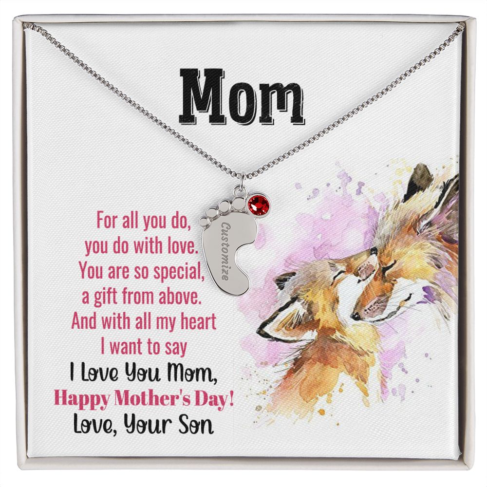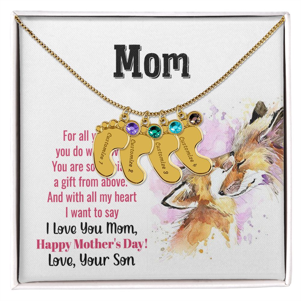 ENGRAVED BABY FEET WITH NAME AND BIRTHSTONE, NECKLACE GIFT FOR MOM WITH KIDS NAME, WITH MESSAGE CARD, MOTHER'S DAY GIFT FOR MOM FROM SON