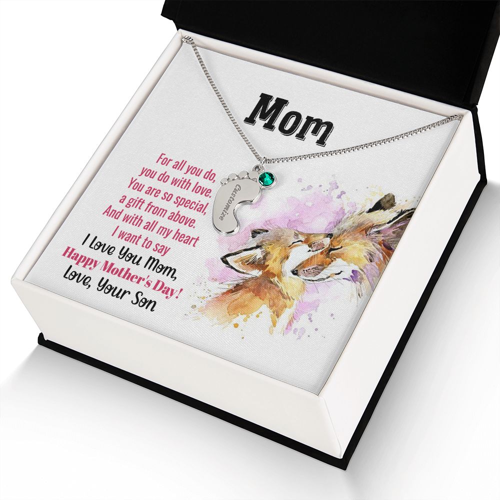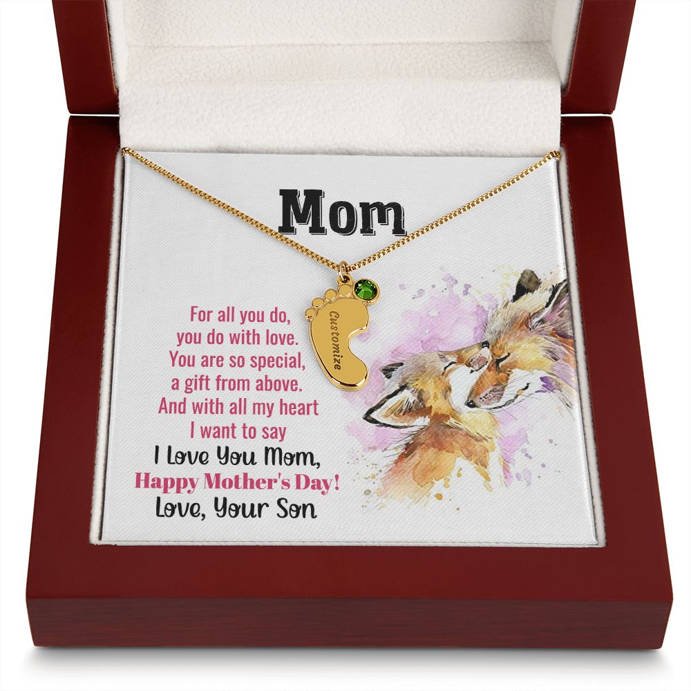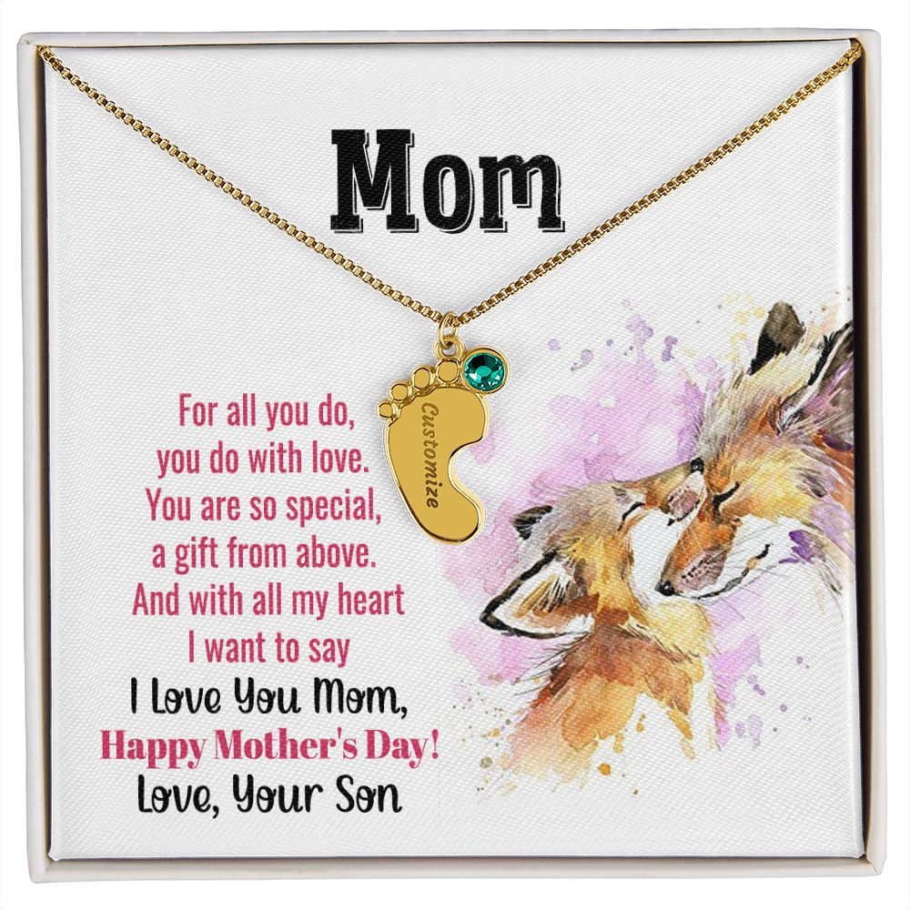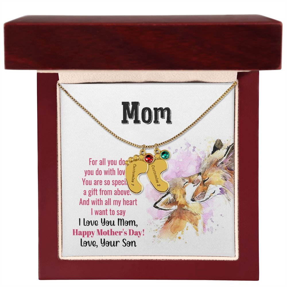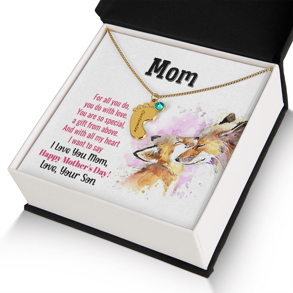 ENGRAVED BABY FEET WITH NAME AND BIRTHSTONE, NECKLACE GIFT FOR MOM WITH KIDS NAME, WITH MESSAGE CARD, MOTHER'S DAY GIFT FOR MOM FROM SON