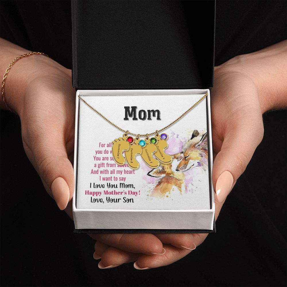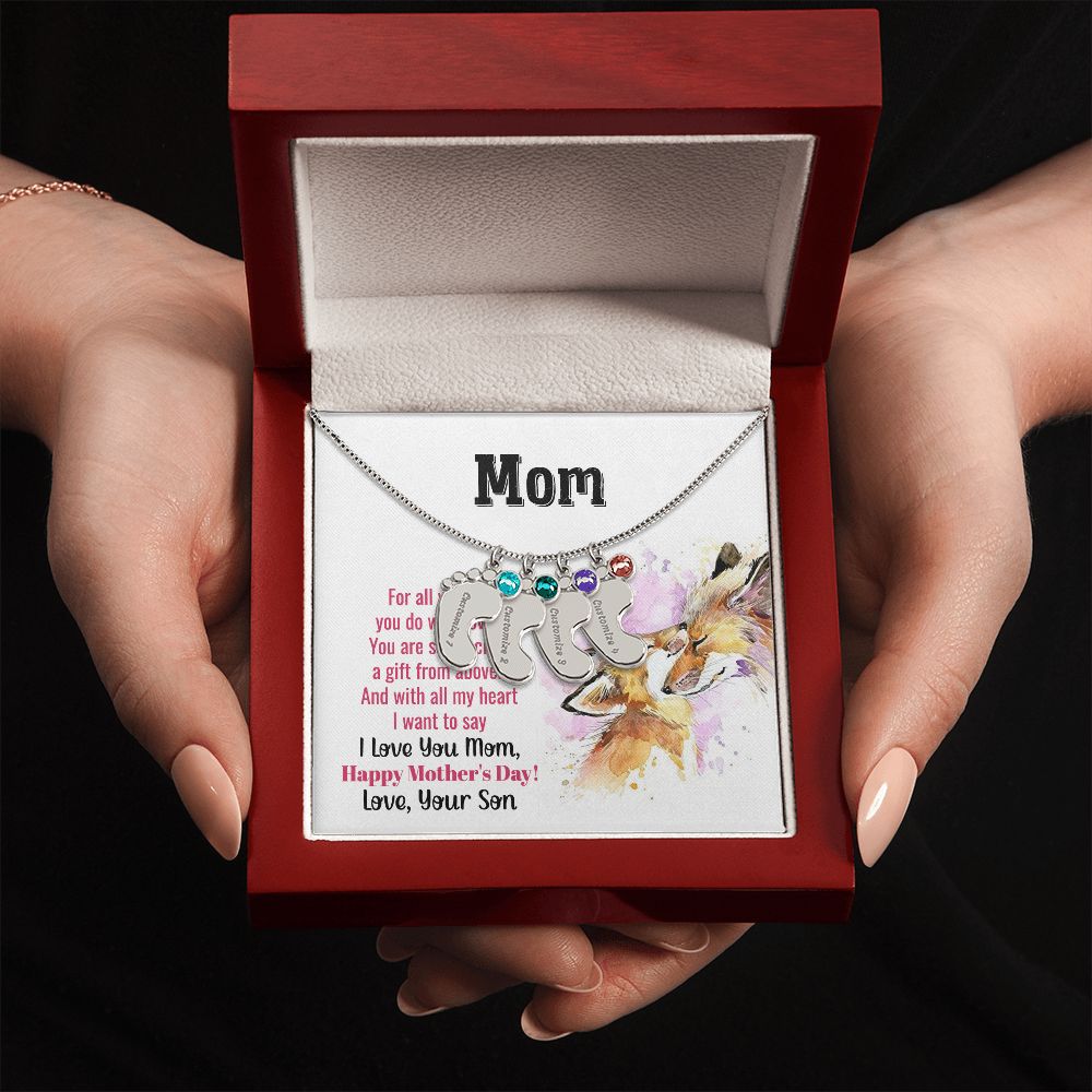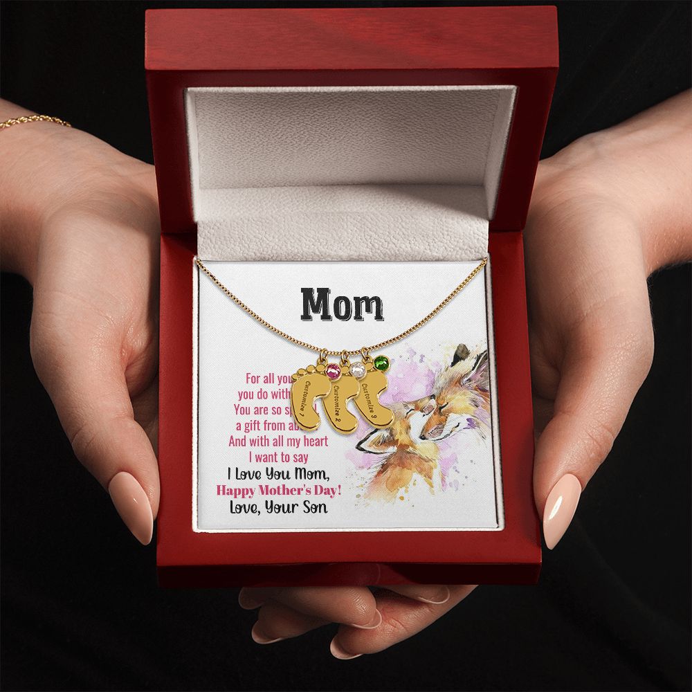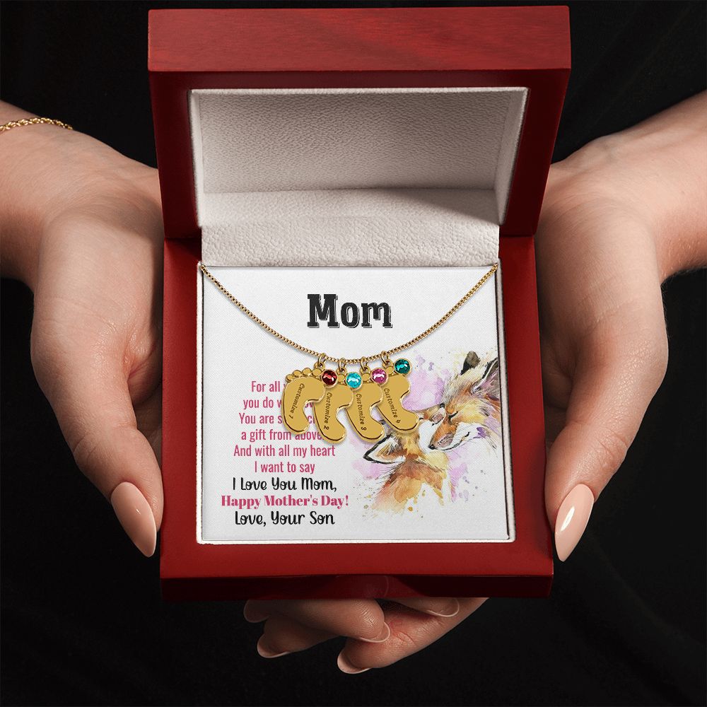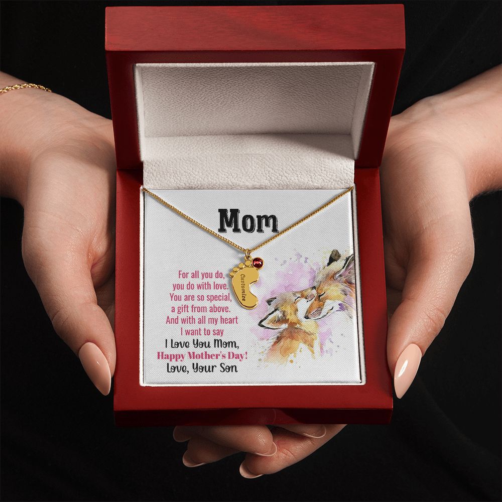 ENGRAVED BABY FEET WITH NAME AND BIRTHSTONE, NECKLACE GIFT FOR MOM WITH KIDS NAME, WITH MESSAGE CARD, MOTHER'S DAY GIFT FOR MOM FROM SON