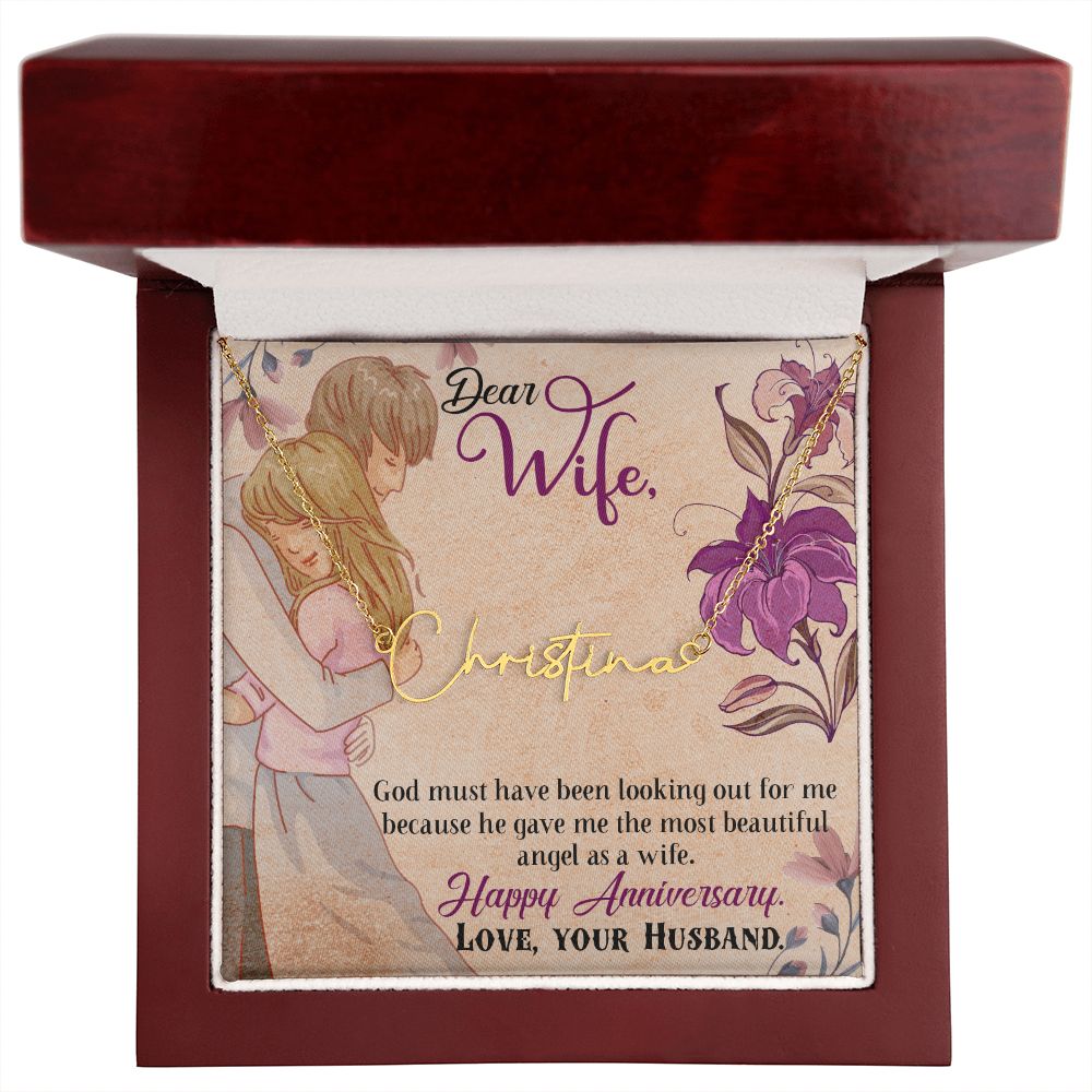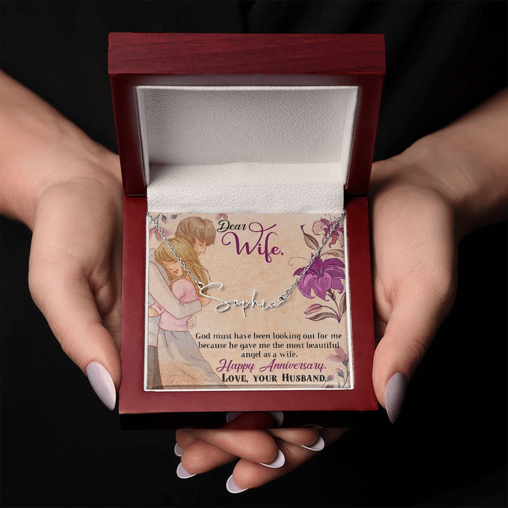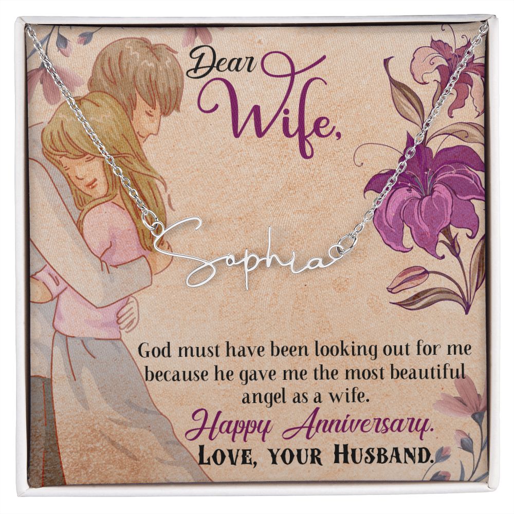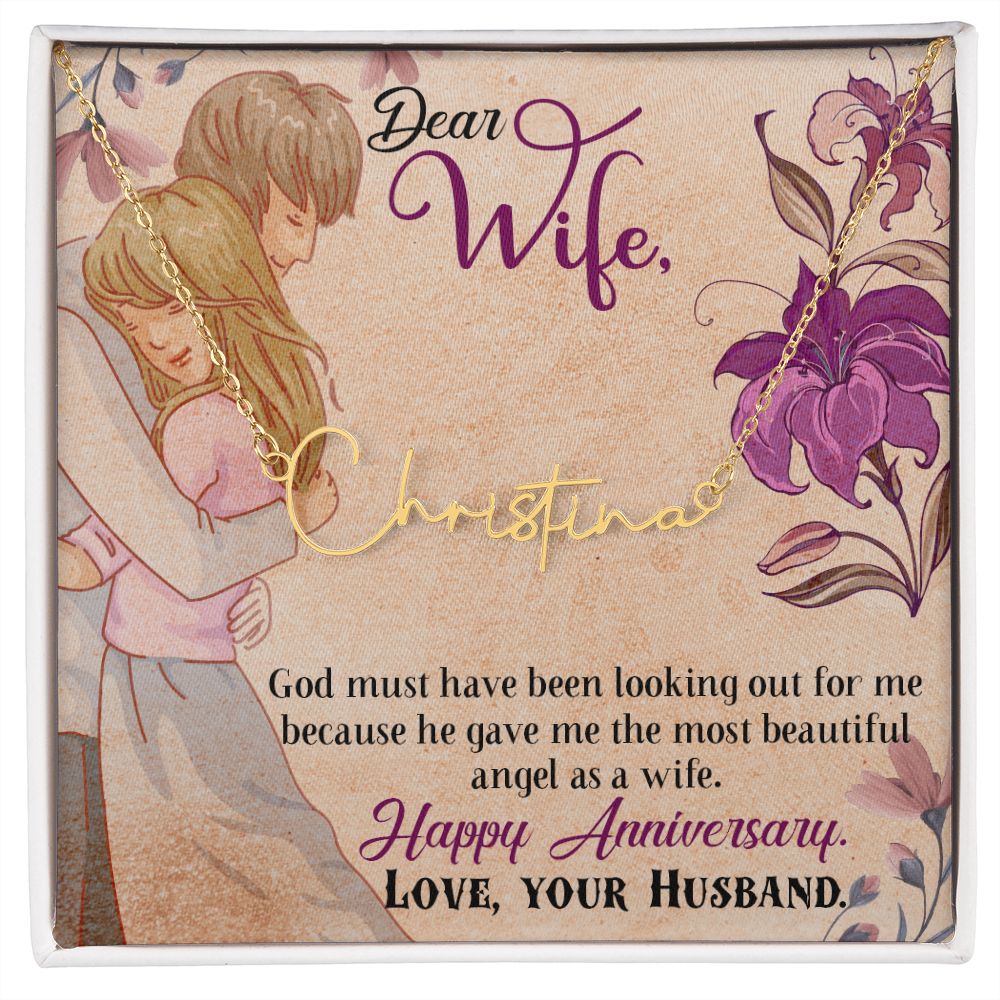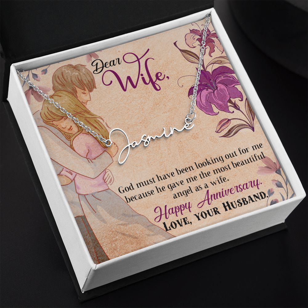 HAPPY ANNIVERSARY, SIGNATURE NAME NECKLACE, GIFT FOR HER, NECKLACE PENDANT WITH MESSAGE CARD, FOR WIFE FROM HUSBAND