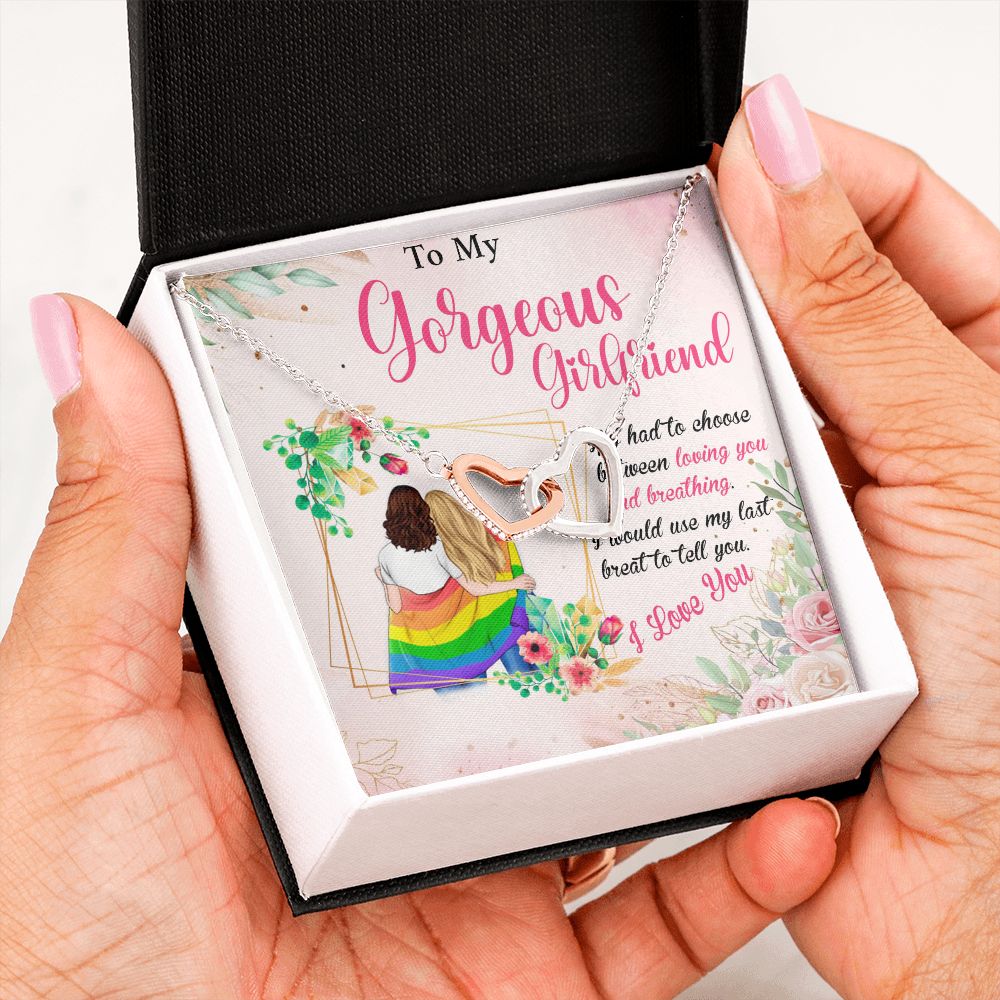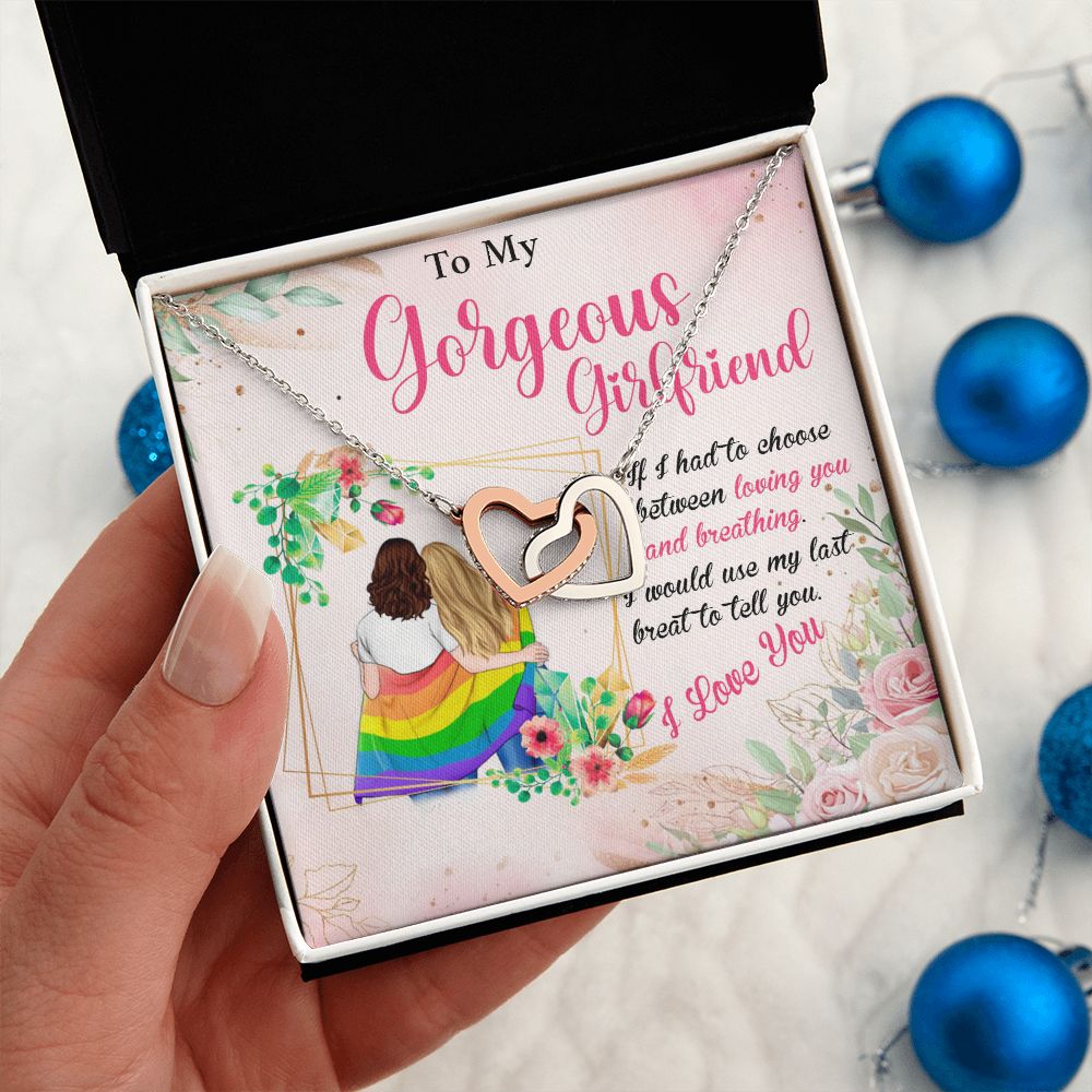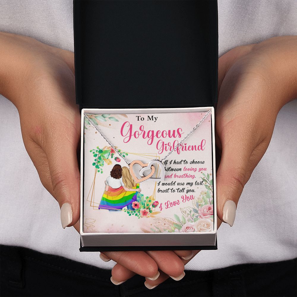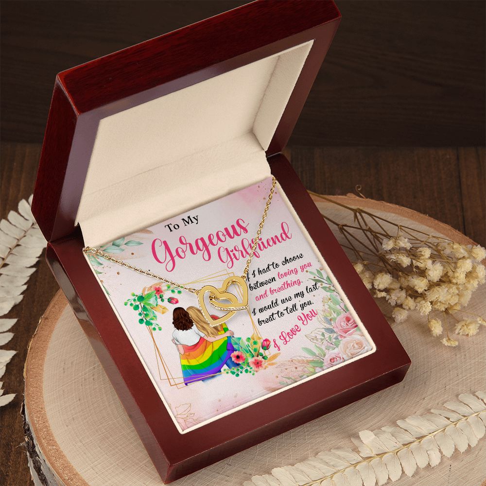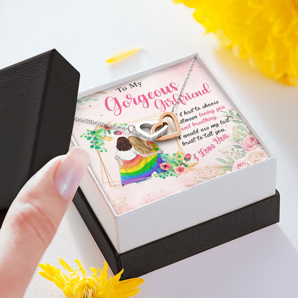 MY GORGEOUS GIRLFRIEND, INTERLOCKING HEART NECKLACE FOR LOVELY SOULMATE, FOR YOUR LGBTQ PARTNER, WITH MESSAGE CARD, PRIDE NECKLACE,