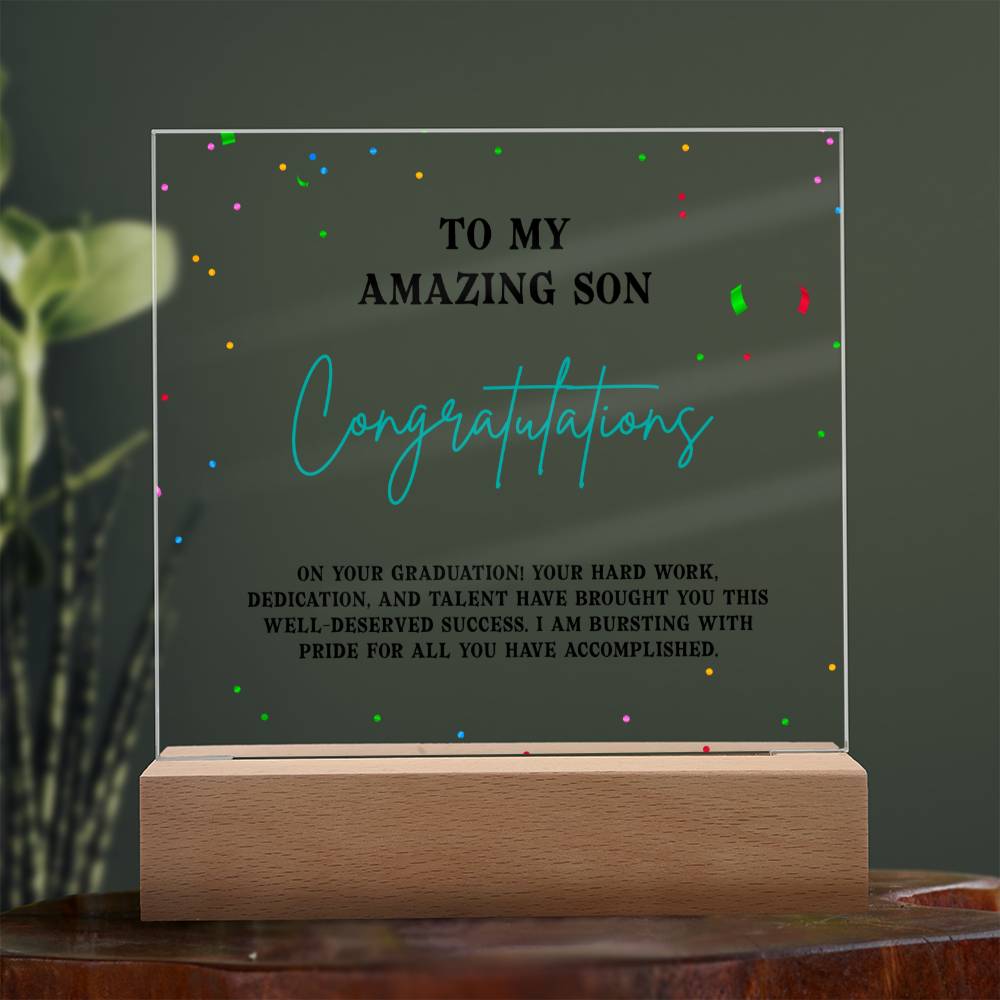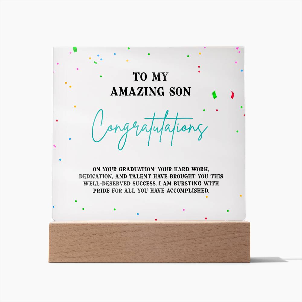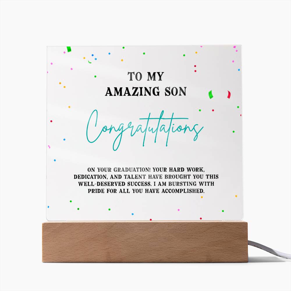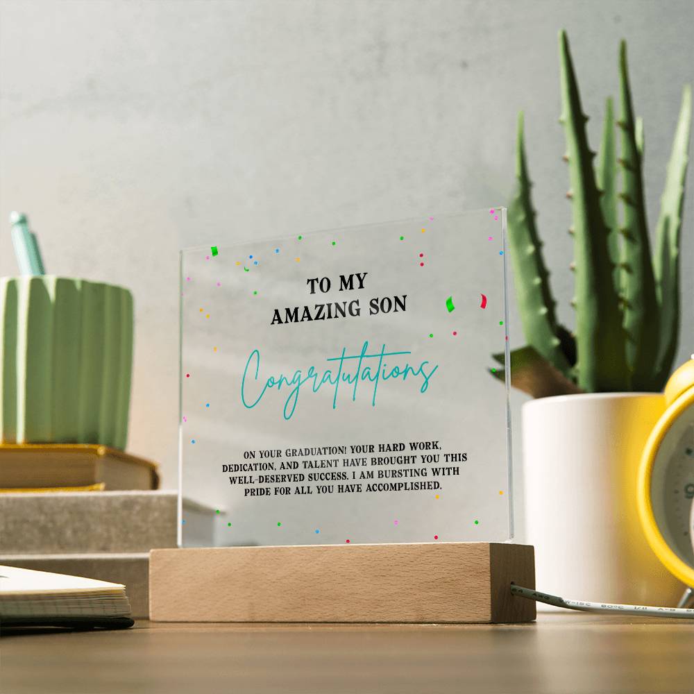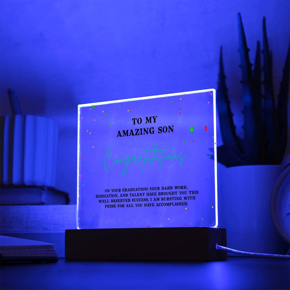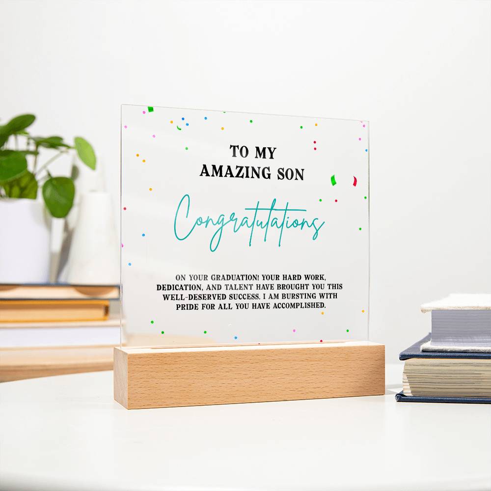 TO MY AMAZING SON, CONGRATULATION ON YOUR GRADUATION, GIFT FOR GRADUATION, ACRYLIC PLAQUE WITH WOODEN LED BASE, GRADUATION GIFT FOR SON