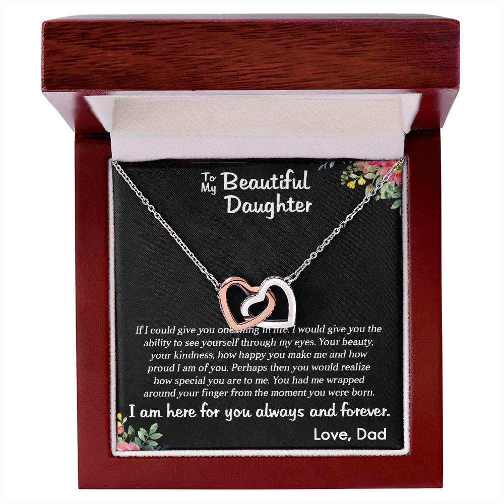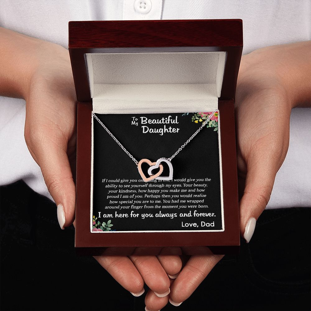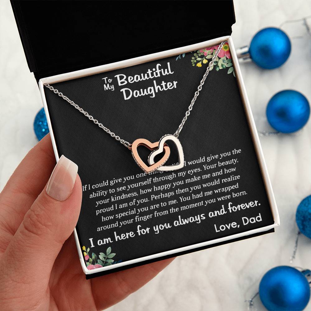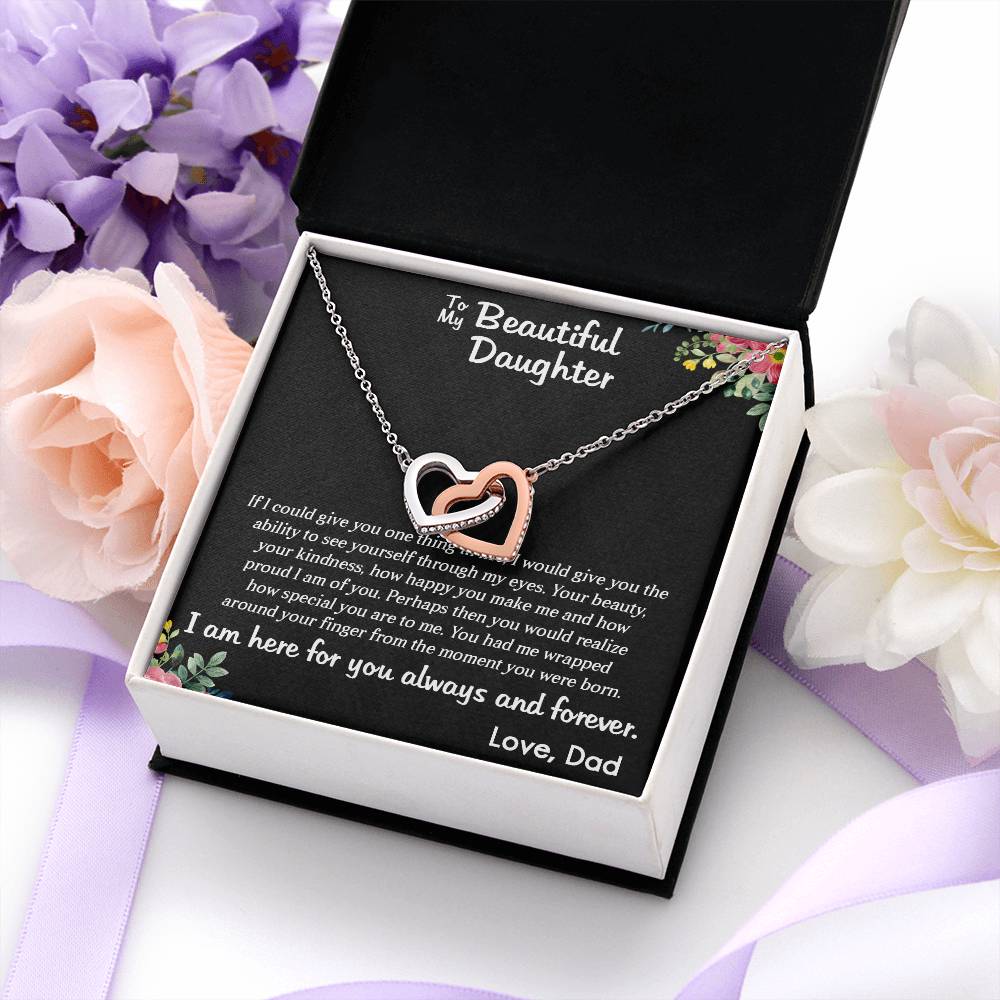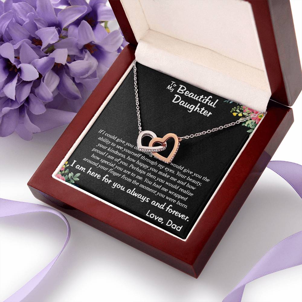 TO MY BEAUTIFUL DAUGHTER, INTERLOCKING HEART NECKLACE WITH MESSAGE CARD, BIRTHDAY GIFT FOR HER, UNQUE GIFT FOR DAUGHTER FROM DAD, ALWAYS AND FOREVER