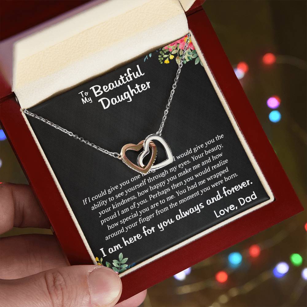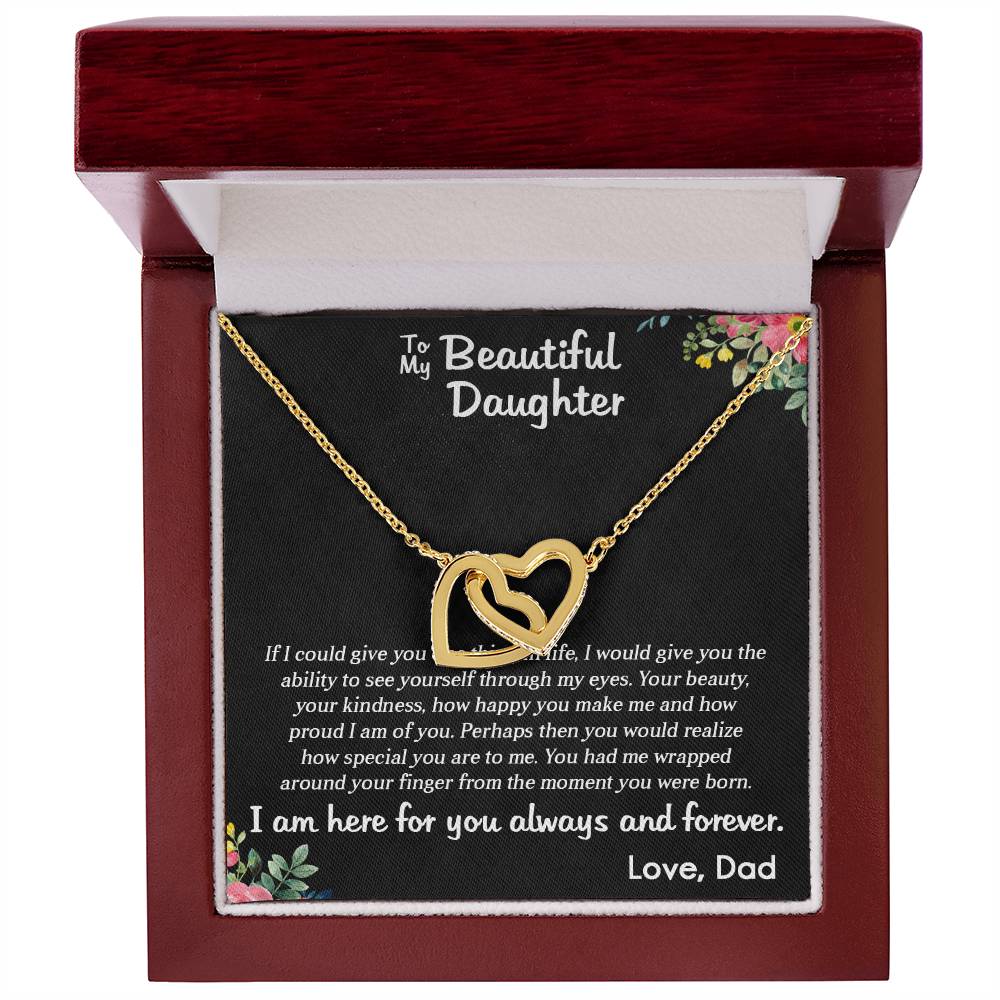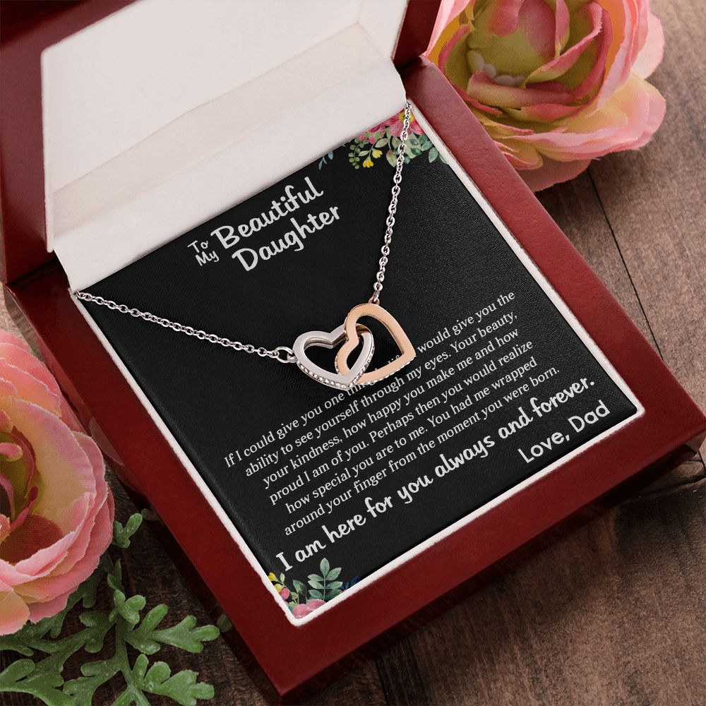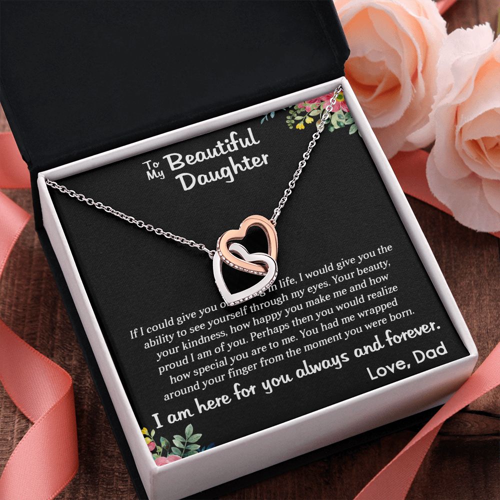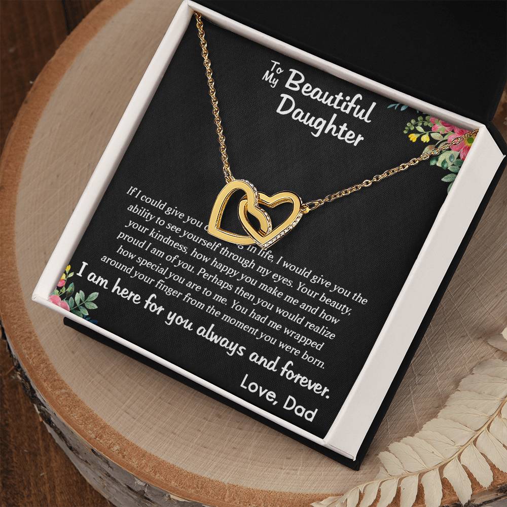 TO MY BEAUTIFUL DAUGHTER, INTERLOCKING HEART NECKLACE WITH MESSAGE CARD, BIRTHDAY GIFT FOR HER, UNQUE GIFT FOR DAUGHTER FROM DAD, ALWAYS AND FOREVER