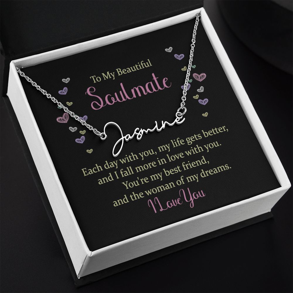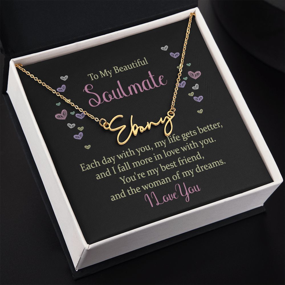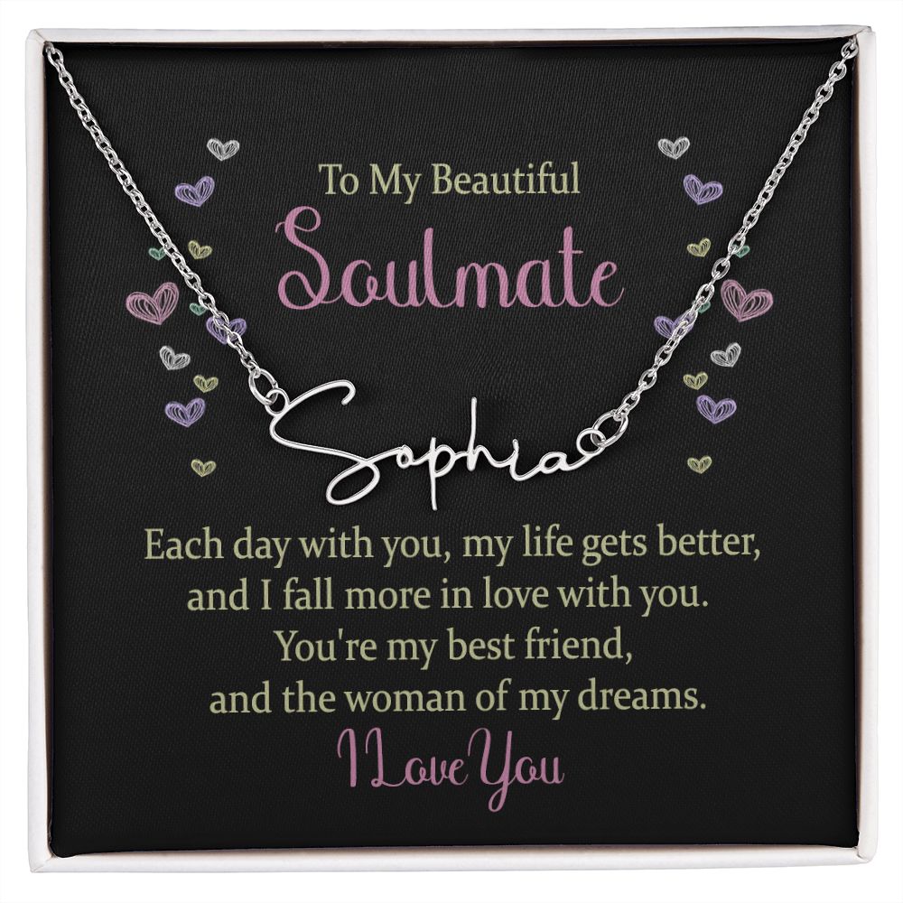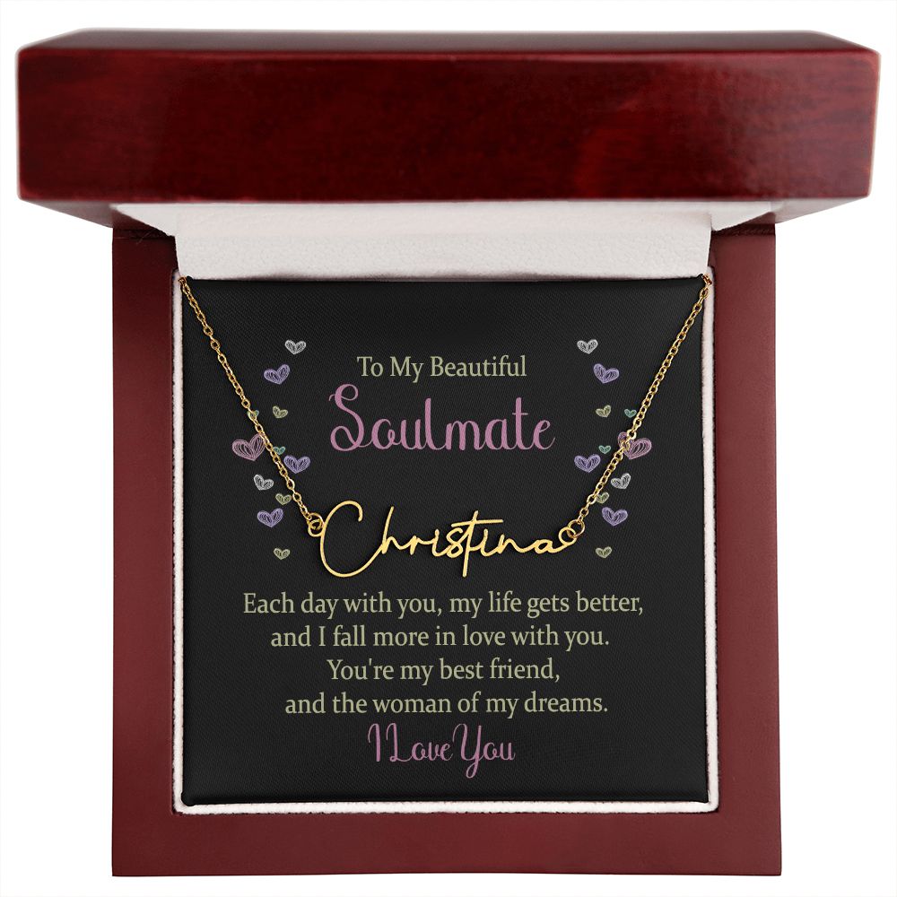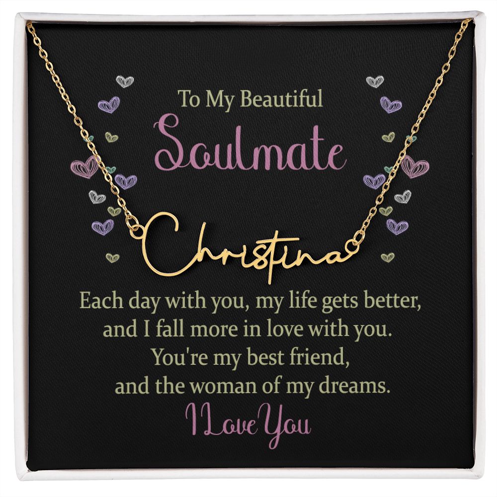 TO MY BEAUTIFUL SOULMATE, SIGNATURE NAME NECKLACE, GIFT FOR HER, NECKLACE PENDANT WITH MESSAGE CARD, FOR WIFE FROM HUSBAND
