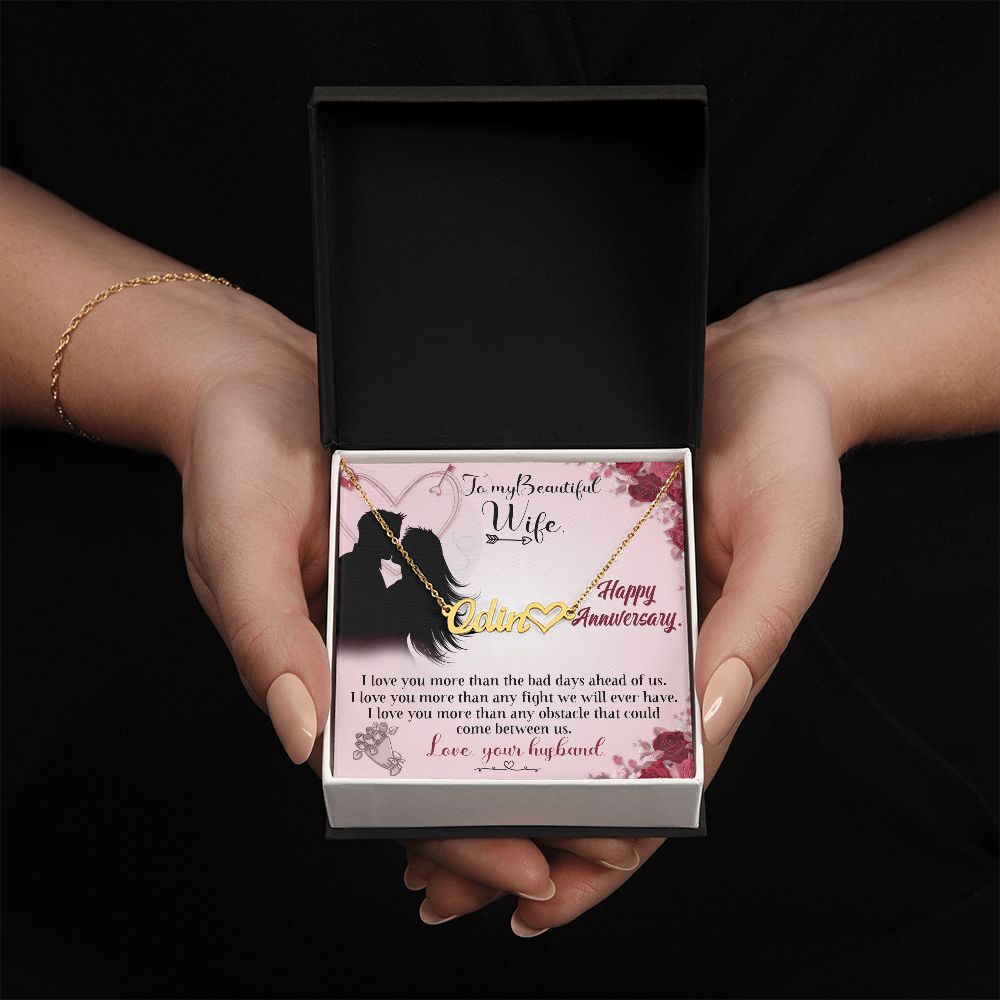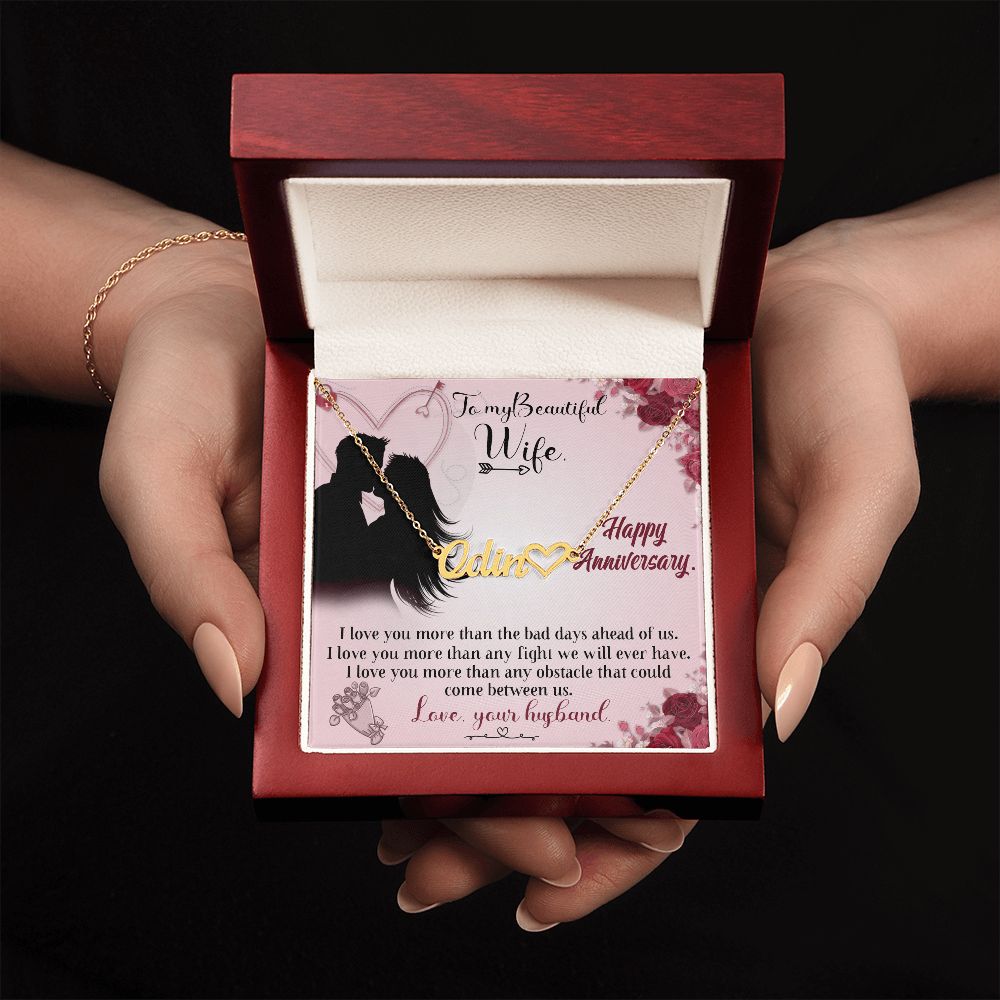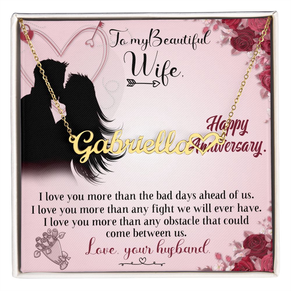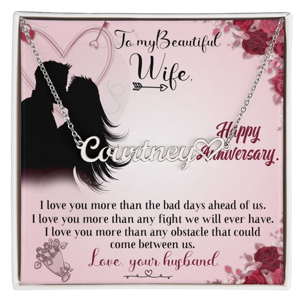 TO MY BEAUTIFUL WIFE HAPPY ANNIVERSARY, CUSTOM NAME WITH HEART NECKLACE, GIFT FOR HER, NECKLACE PENDANT WITH MESSAGE CARD, FOR WIFE FROM HUSBAND