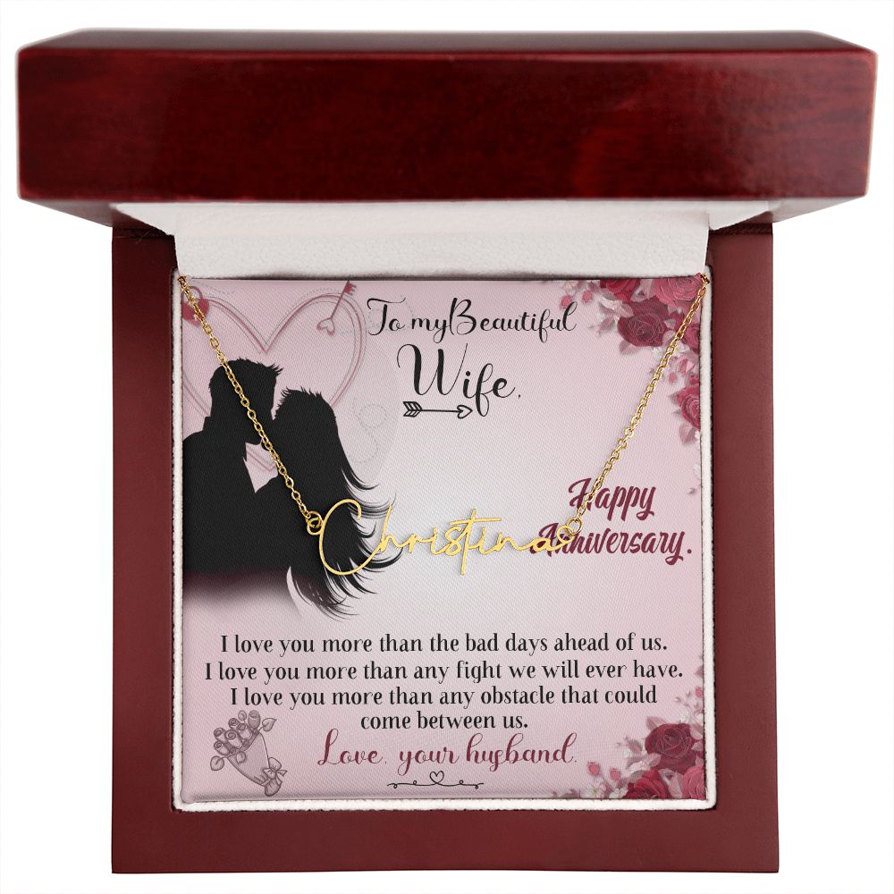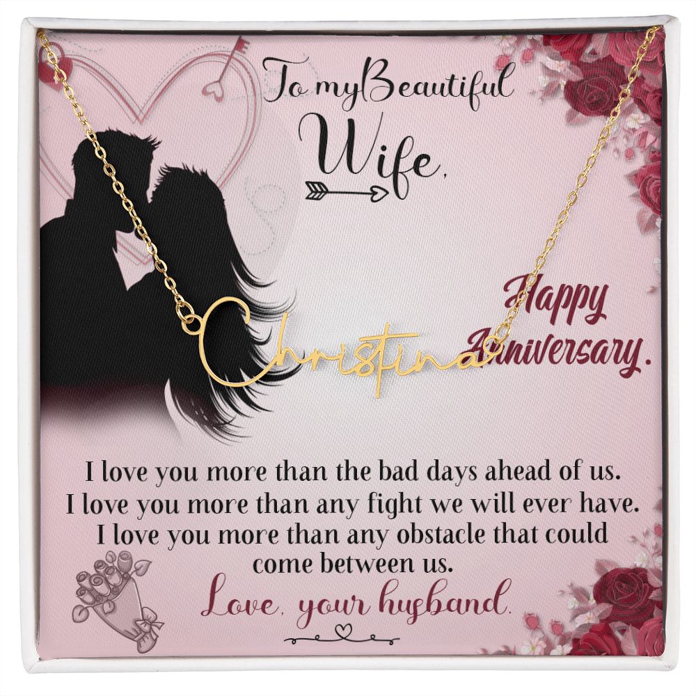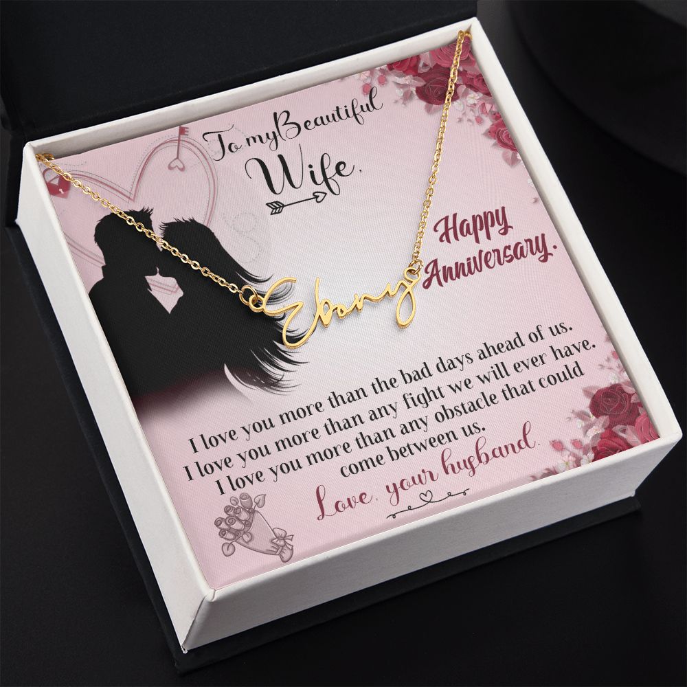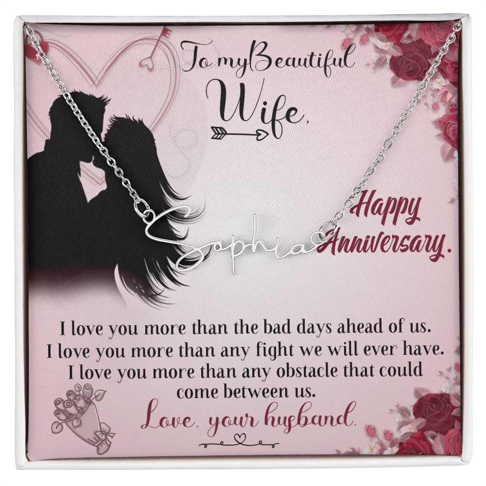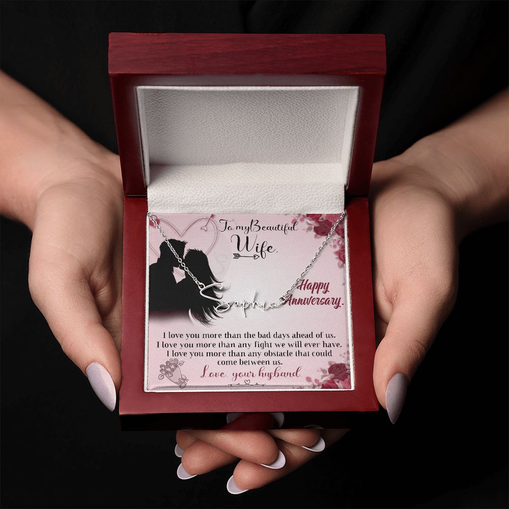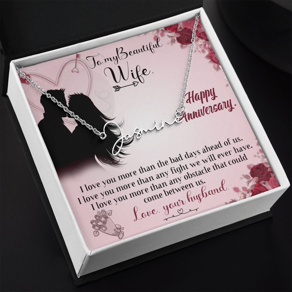 TO MY BEAUTIFUL WIFE HAPPY ANNIVERSARY, SIGNATURE NAME NECKLACE, GIFT FOR HER, NECKLACE PENDANT WITH MESSAGE CARD, FOR WIFE FROM HUSBAND