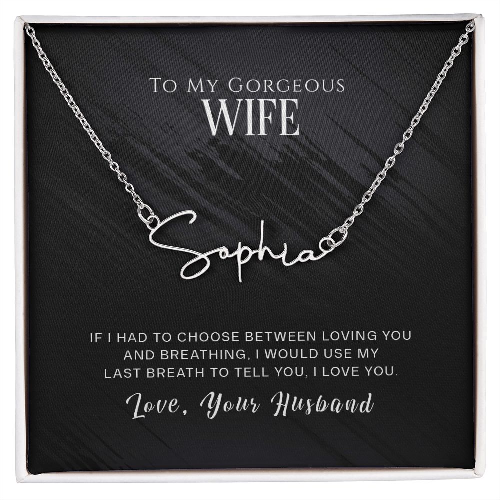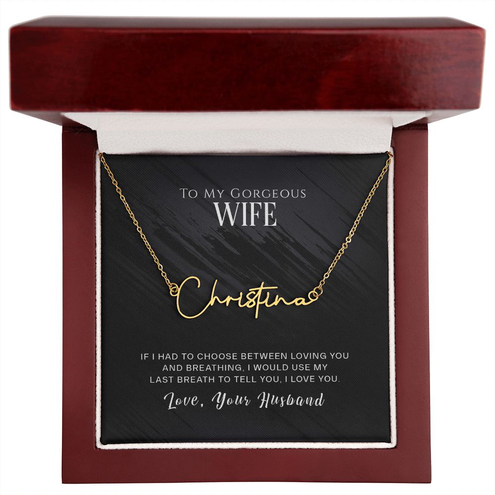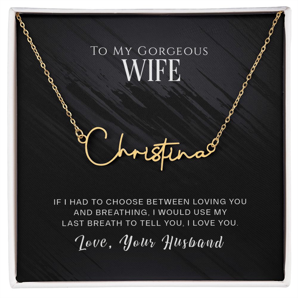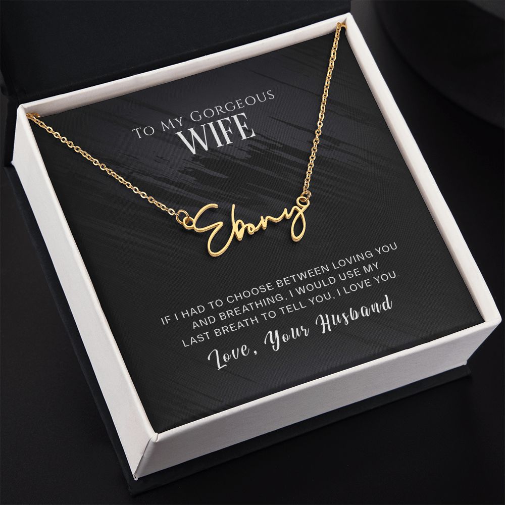 TO MY GORGEOUS WIFE, SIGNATURE NAME NECKLACE, GIFT FOR HER, NECKLACE PENDANT WITH MESSAGE CARD, FOR WIFE FROM HUSBAND