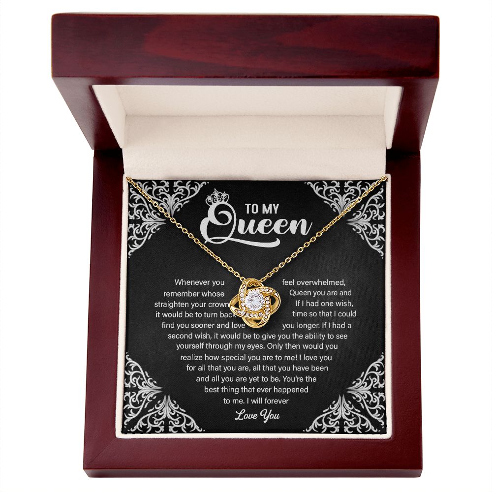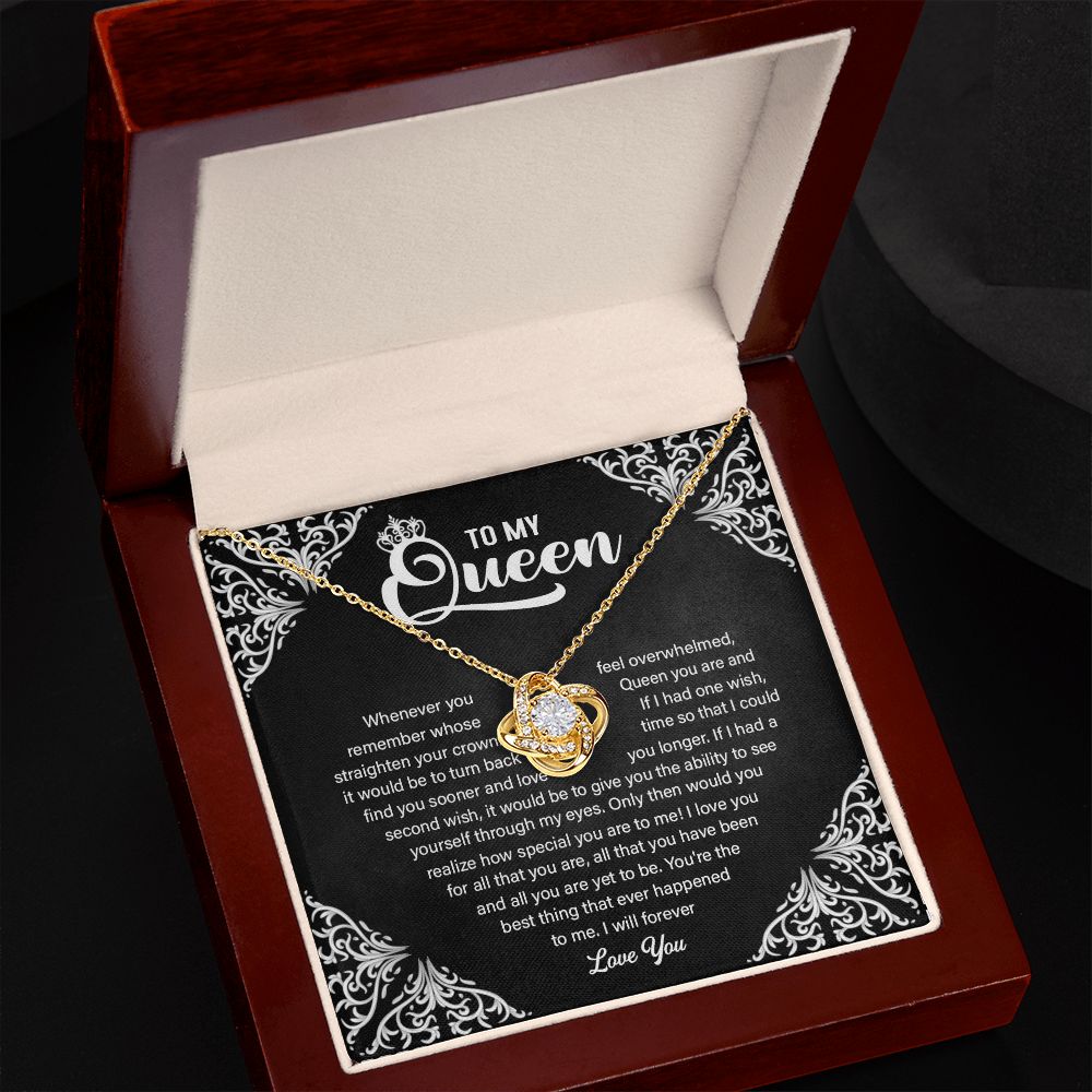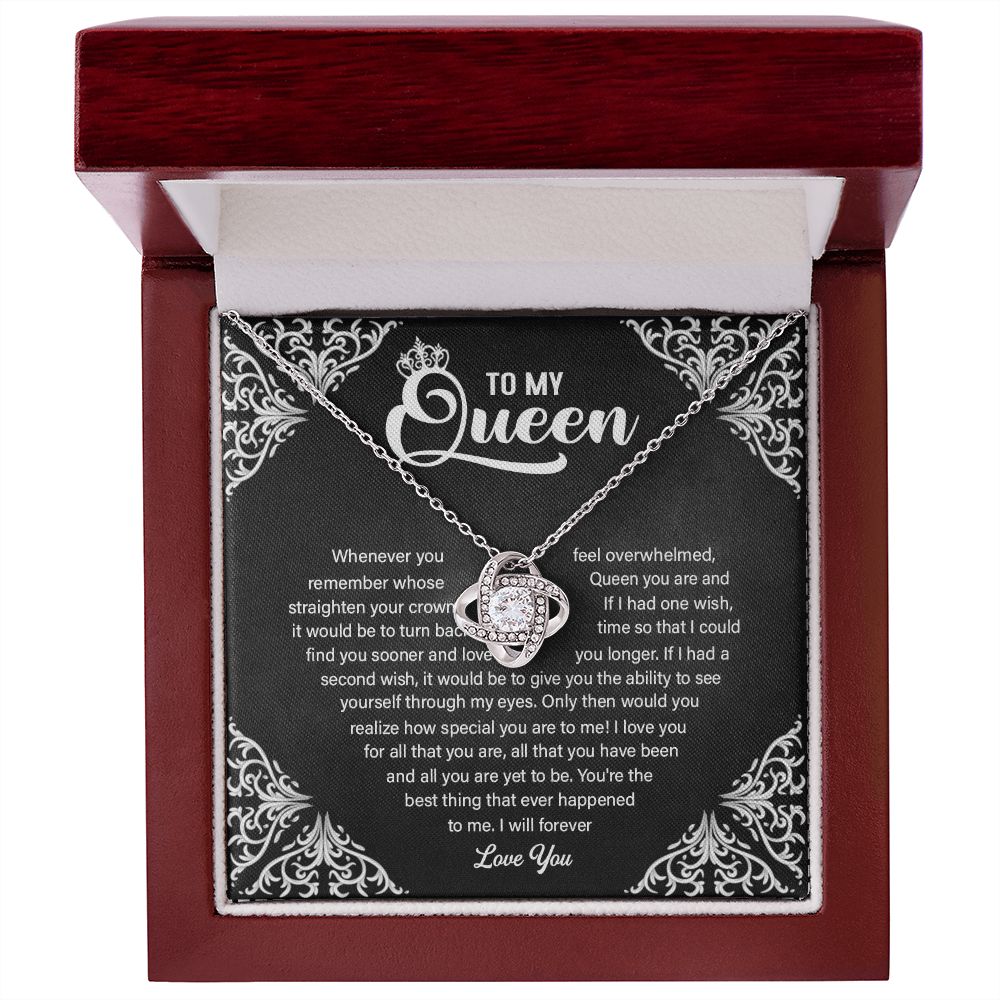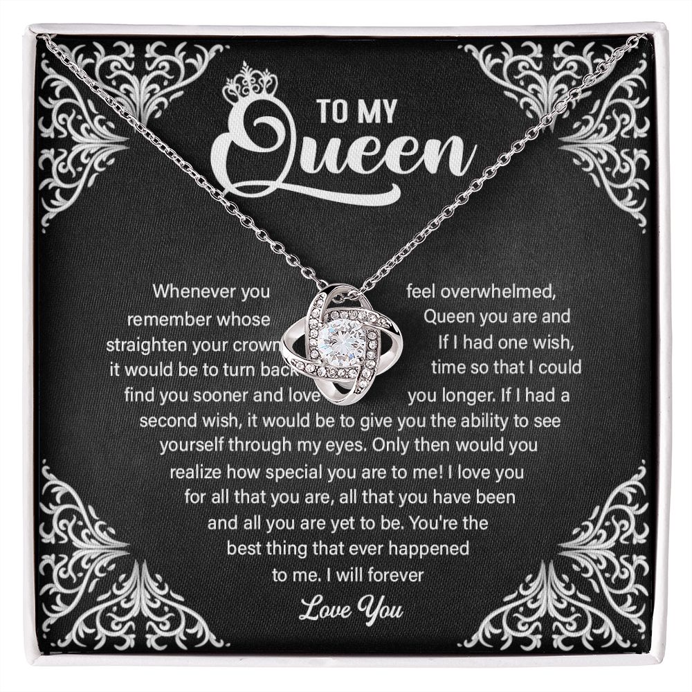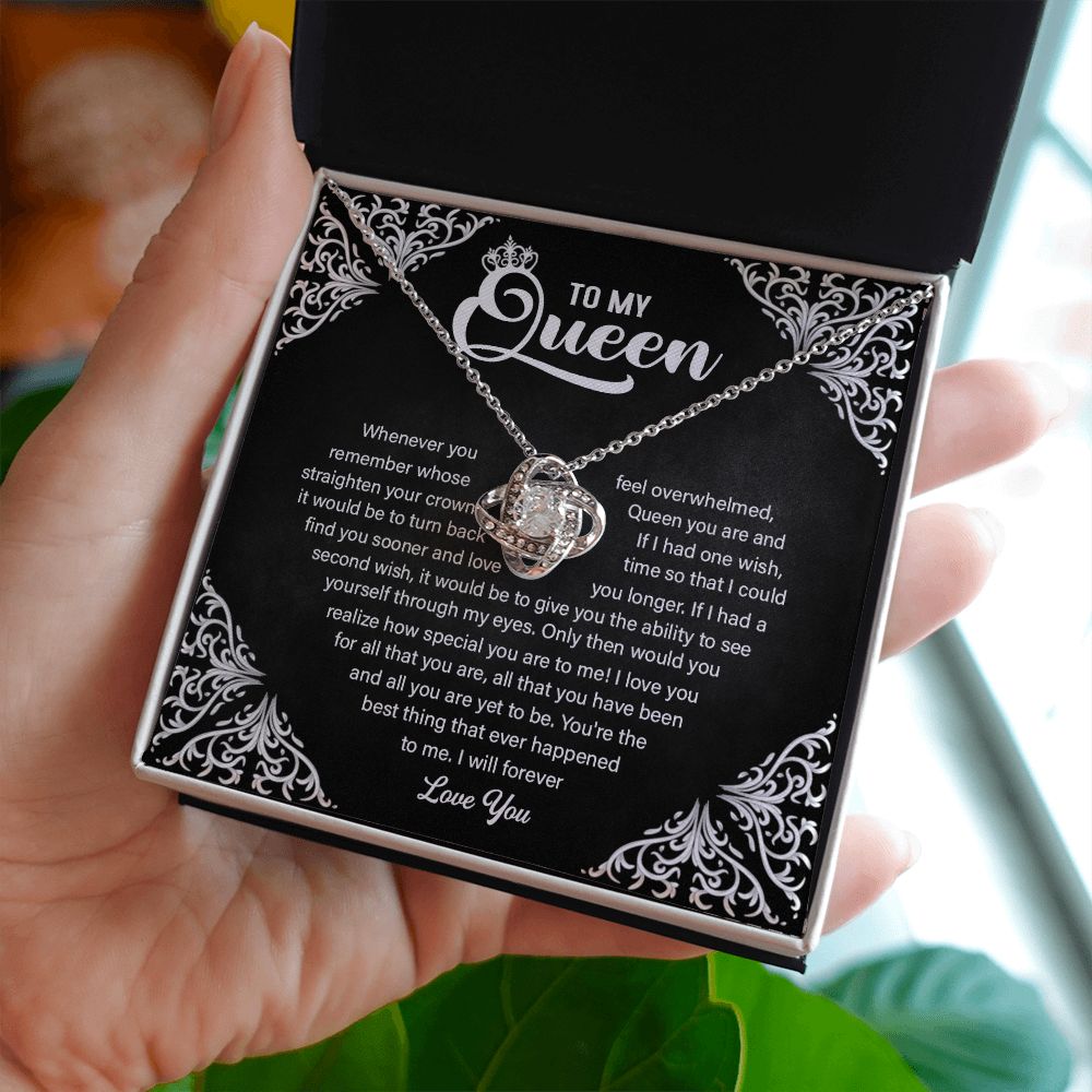 TO MY QUEEN, LOVE KNOT NECKLACE WITH MESSAGE CARD, GIFT FOR WIFE/SOULMATE, BIRTHDAY GIFT FOR HER