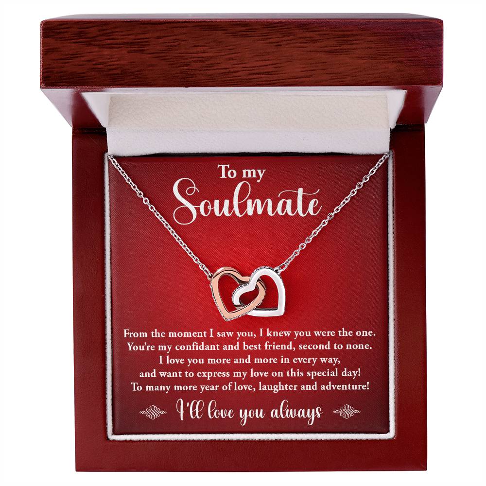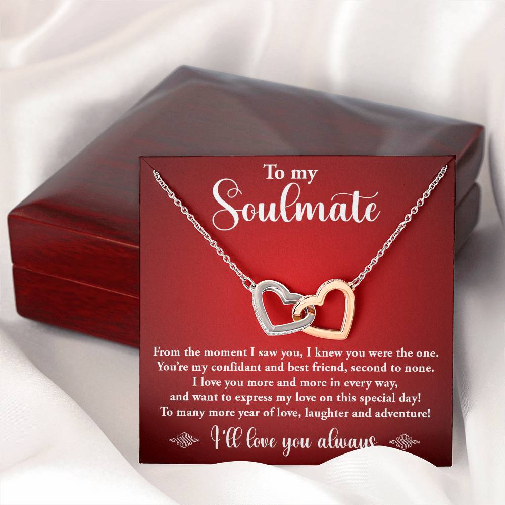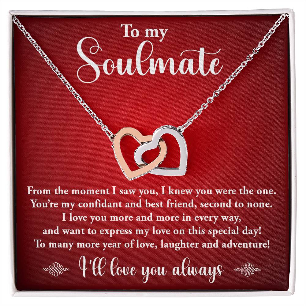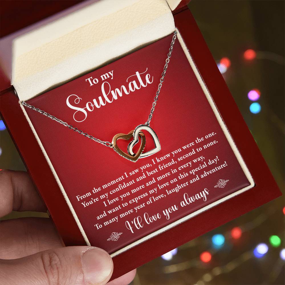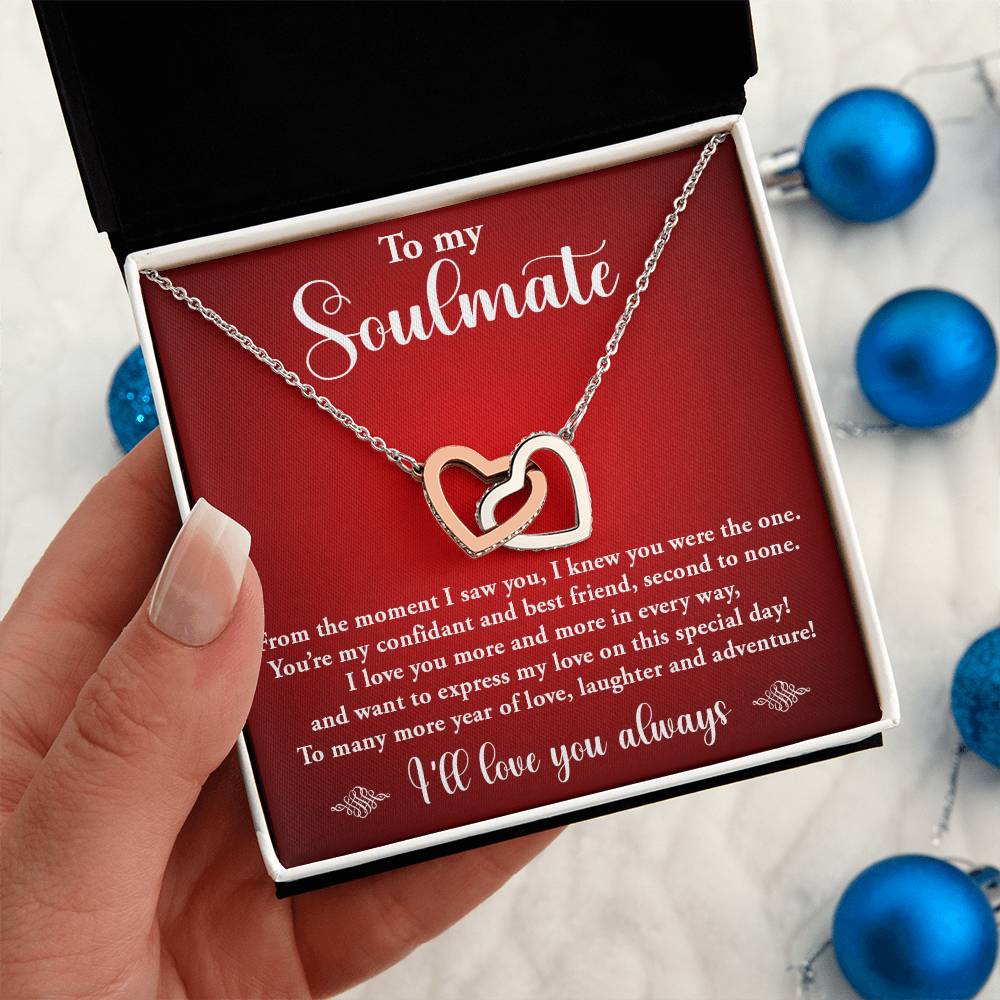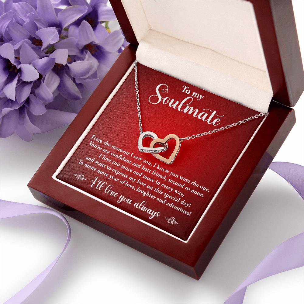 TO MY SOULMATE, INTERLOCKING HEART NECKLACE WITH MESSAGE CARD, BIRTHDAY GIFT FOR HER