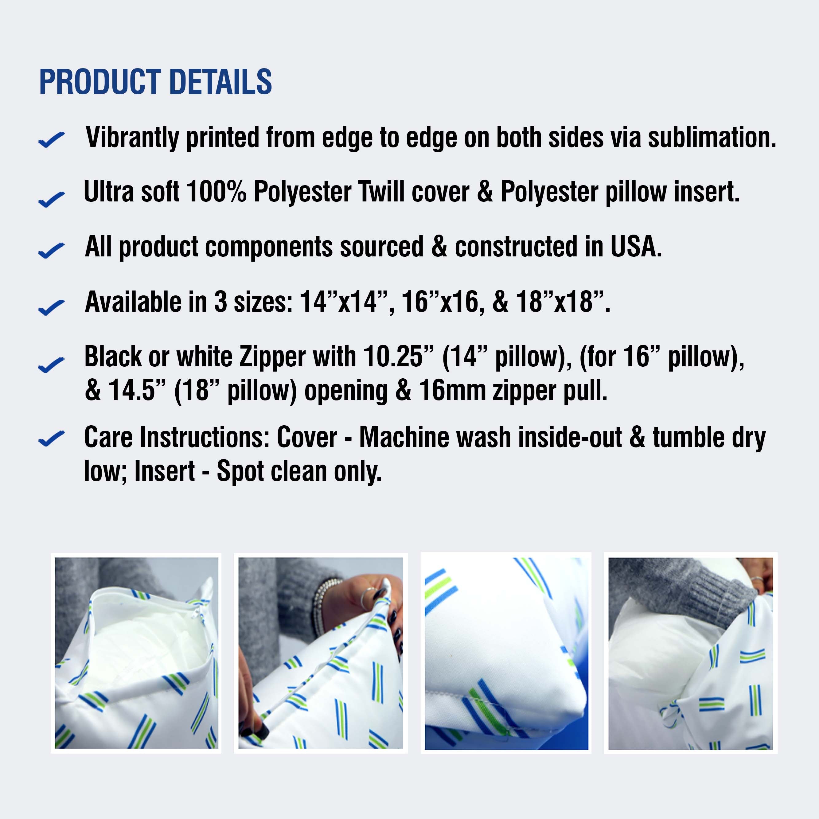 - Zipper with 10.25” (14” pillow), 12” (for 16” pillow), & 14.5” (18” pillow) opening & 16mm zipper pull