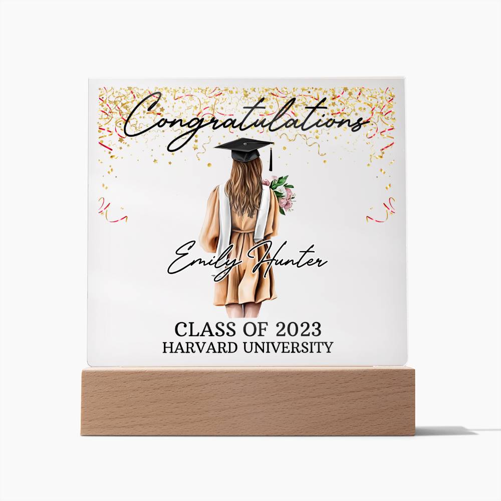 PERSONALIZED ACRYLIC PLAQUE FOR CLASS OF 2023 GRADUATE, PERSONALIZED GIFT FOR HER, ACRYLIC PLAQUE WITH WOODEN LED BASE, GRADUATION DESK DECOR, HARVARD UNIVERSITY COLLEGE GIFT FOR FRIEND