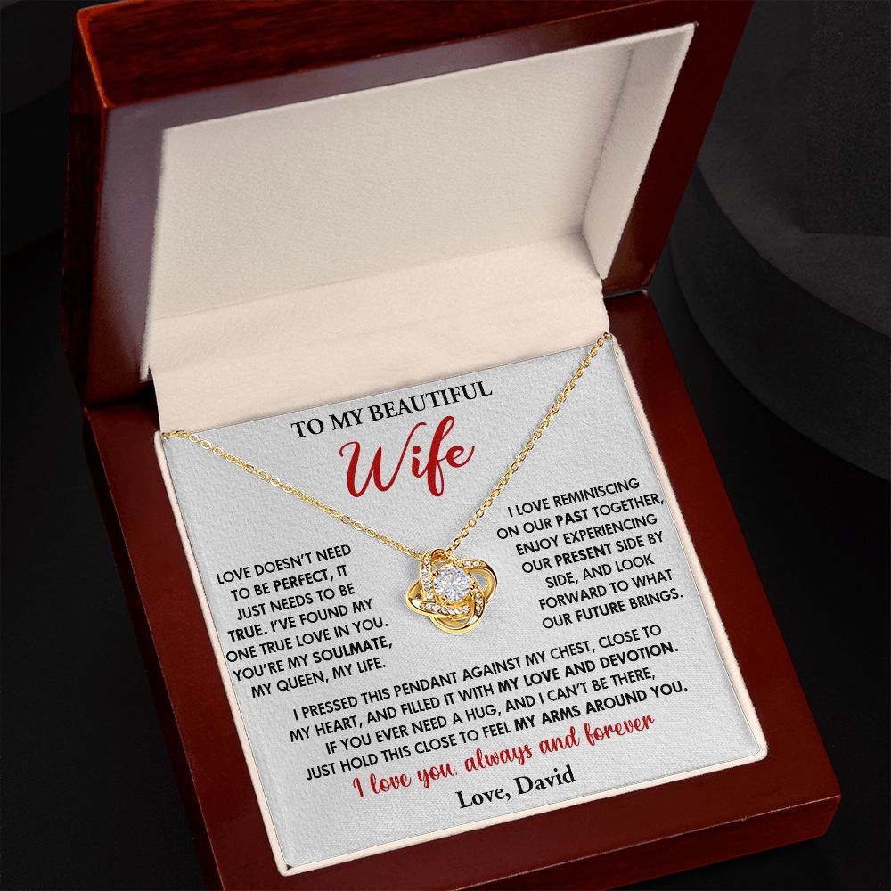 TO MY BEAUTIFUL WIFE, LOVE KNOT NECKLACE WITH CUSTOM NAME MESSAGE CARD, GIFT FOR WIFE/SOULMATE, BIRTHDAY GIFT FOR HER